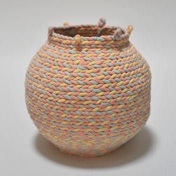 釣光穂は1991年兵庫県生まれ。2014年京都市立芸術大学美術学部工芸科陶磁器専攻卒業、16年同大学修士課程美術研究科工芸専攻陶磁器修了。2020年金沢市卯辰山工芸工房修了。日常世界に目にする容器を観察し、独自の編み物陶芸の「うつわ」につくり変える。器としての用途がないうつわを通して、容器の概念を問いかける作品である。主な個展に、「パレットの実験」(KUNST ARZT、京都、2021)、「空中ひもづくり」(ルンパルンパ、石川、2019)、「うつわの標本」(KUNST ARZT、京都、2016)、グループ展に、「ルンパルンパKanazawa Newly arrived Art&Craft 2017」(青山スパイラル、東京)など。金沢市工芸展 NHK金沢放送局長賞(2019)、金沢卯辰山工芸工房研修者作品展 卯辰山工芸工房賞(2019)などを受賞。