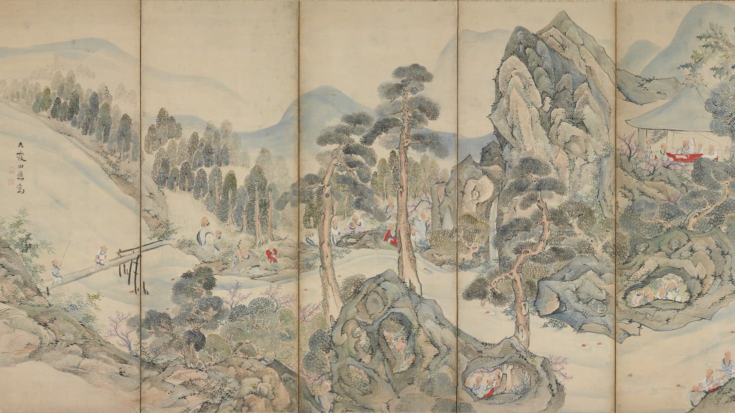 池大雅は18世紀に活躍した文人画家。1723(享保8)年、京都の町人の子として生まれる。その才能は早熟で、7歳のときに万福寺で書を披露し絶賛されている。37(元文2)年、亡き父の通称であった菱屋嘉左衛門を襲名し、扇屋を開いた。禅僧との交流のなかで大陸の文物にふれていた大雅は、文人趣味の扇絵を描いていたという。この前後に柳沢淇園と出会い、絵を学ぶ。20代の模索の時代には、指頭画(筆のかわりに手指を用いて描く)などにも挑戦した。やがて、旅行や登山が好きだった大雅は、自らの足で歩き実際に見た景色を数多く描き(真景図)、中国絵画の模倣に終わらない、のびのびと大らかな画風を確立し定評を得ていく。20代半ばには、淇園の仲介により、13歳の木村蒹葭堂が大雅に入門した。経済的な余裕はあまりなかったが、金銭には無頓着で、当時の文化人たちと親しく交遊し、自らの理想とする文人生活を送っていたとされる。71(明和8)年に与謝蕪村と描いた《十便十宜図》は、日本近世の文人画の双璧による記念碑的合作である。妻の玉瀾も文人画家であり、風変わりながら仲むつまじい夫婦の逸話が伝わる。76(安永5)年没。