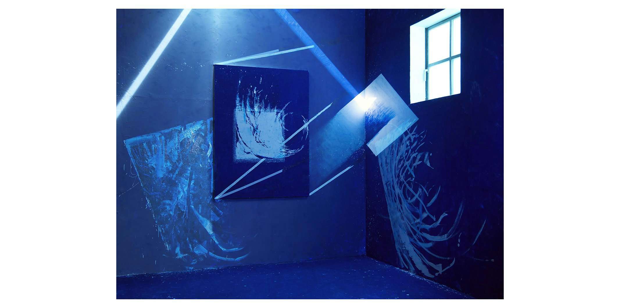 石田尚志は1972年東京都生まれ。絵を描くという行為自体に着目し、抽象的な線を1コマずつ描き、撮影することを繰り返す「ドローイング・アニメーション」の手法を用いて、映像作品やインスタレーション作品、ライブ・ペインティングを発表。初期作であり「イメージフォーラム・フェスティバル1999」で特選を受賞した《部屋/形態》(1999)では、東大駒場寮の部屋を舞台に、ペンキを用いて壁に描かれる線の様子を1年にわたり撮影。「部屋」を素材のひとつとした作品を手がけ、増殖する線、移動する点といった運動性で空間を様々に変容させる。