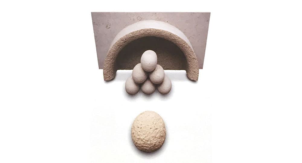 石井厚生は1940年千葉県生まれ。多摩美術大学で日本抽象彫刻のパイオニアである建畠覚造(1919〜2006)の薫陶を受け、大学卒業後から行動美術展などを中心に国内外で発表。パブリック・アートの仕事も数多く手がける。初期の金属作品や1980年代の石彫を経て、2000年代からは赤レンガを素材とした作品を発表。美術批評家ハーバート・リードの著書『近代彫刻史』を裁断して混入したモルタルで赤レンガを接着し、円環、円盤、壺などを形成するなど、つねに彫刻の根源を追い求めてきた石井の強い意志を感じ取ることができる。主な個展に「西風と東風のまにまに」(三重県立美術館柳原義達記念館、2009)など。中原悌二郎賞優秀賞(1992)、本郷新賞(2005)などを受賞。