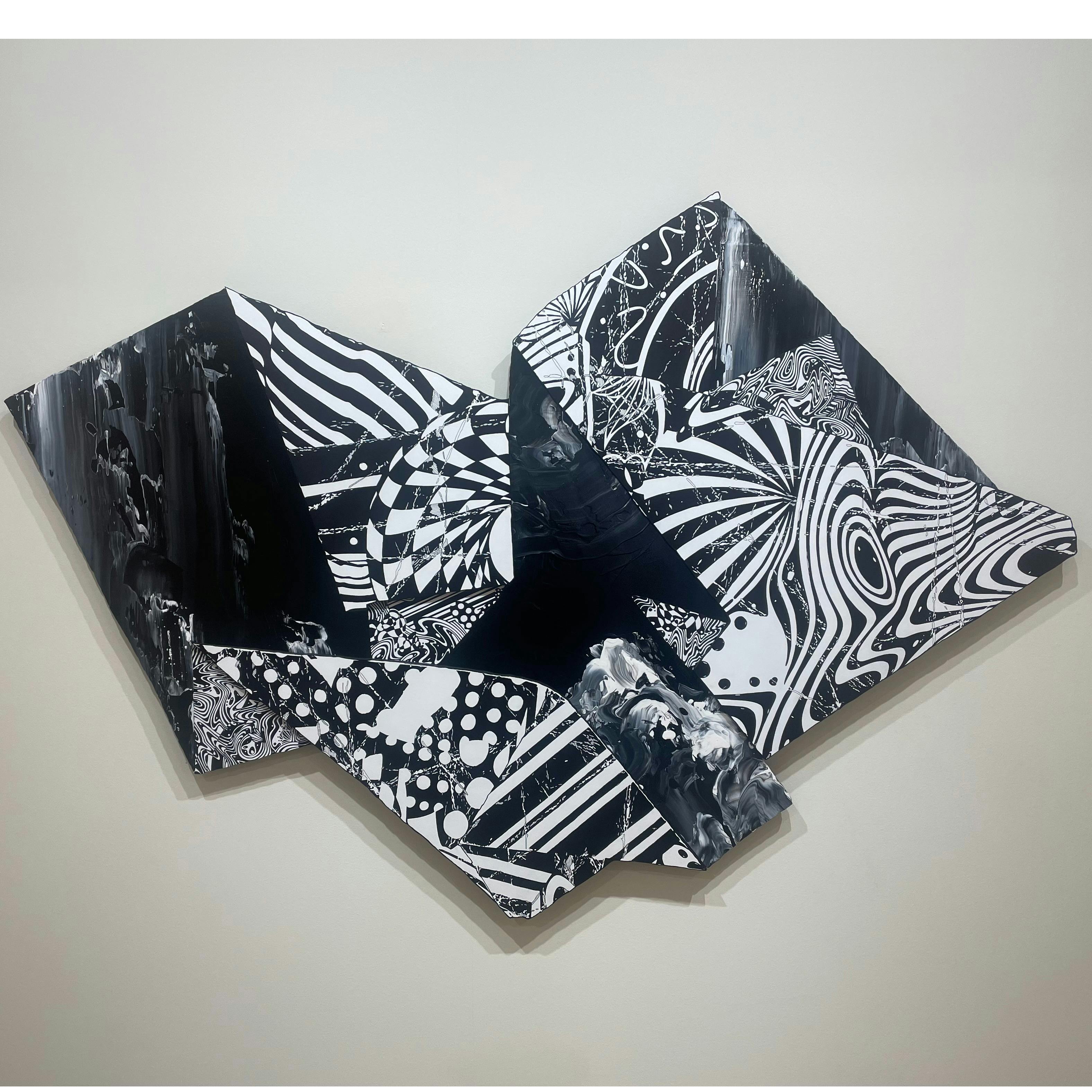 TAKERU IWAZAKIは、ストリートカルチャーや電子音楽などに影響を受けて創作を始める。水の流れや樹木の佇まいなど、自然界の現象に影響を受け、「FLOW(流れ)」をテーマのひとつとして、万物が放つエネルギーを伸びやかな線に集積させ、黒を基調とした線と線が緻密に拡がるドローイングを特徴とする。