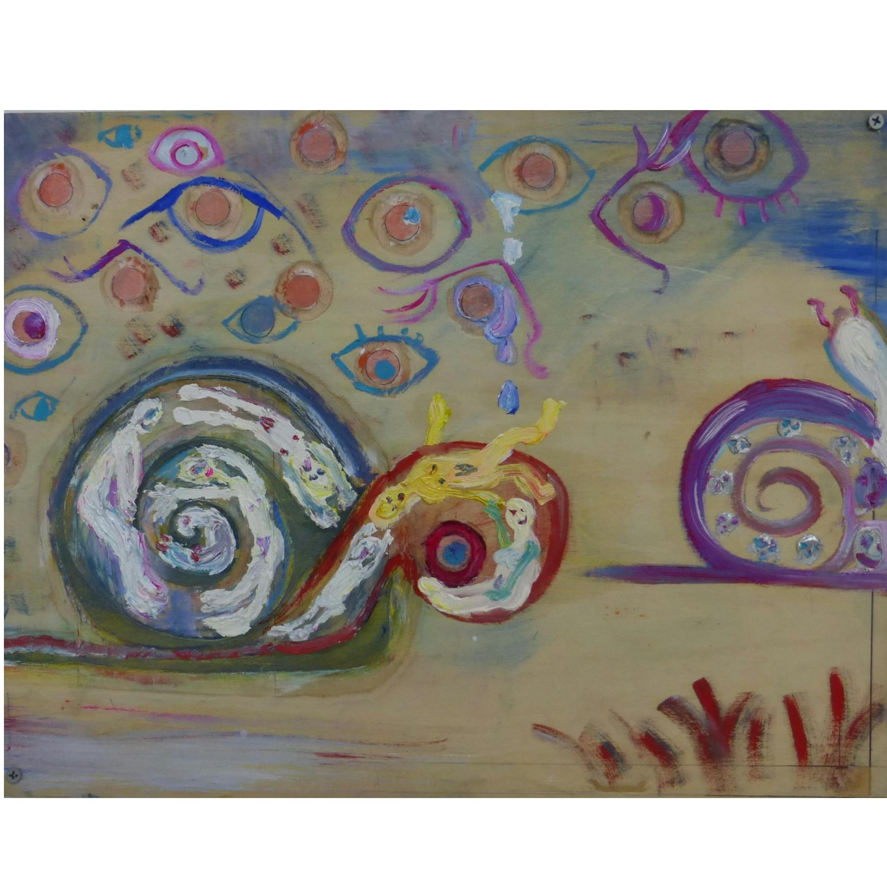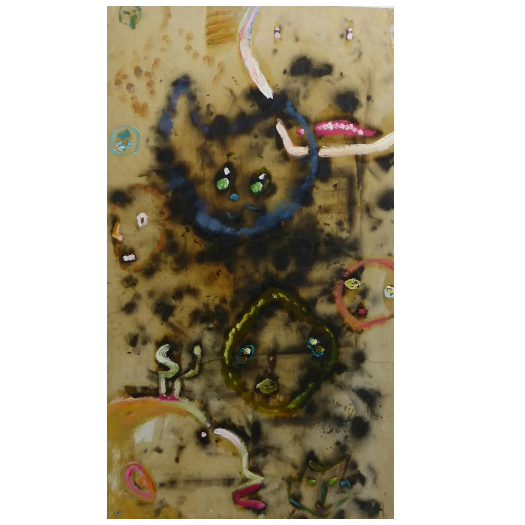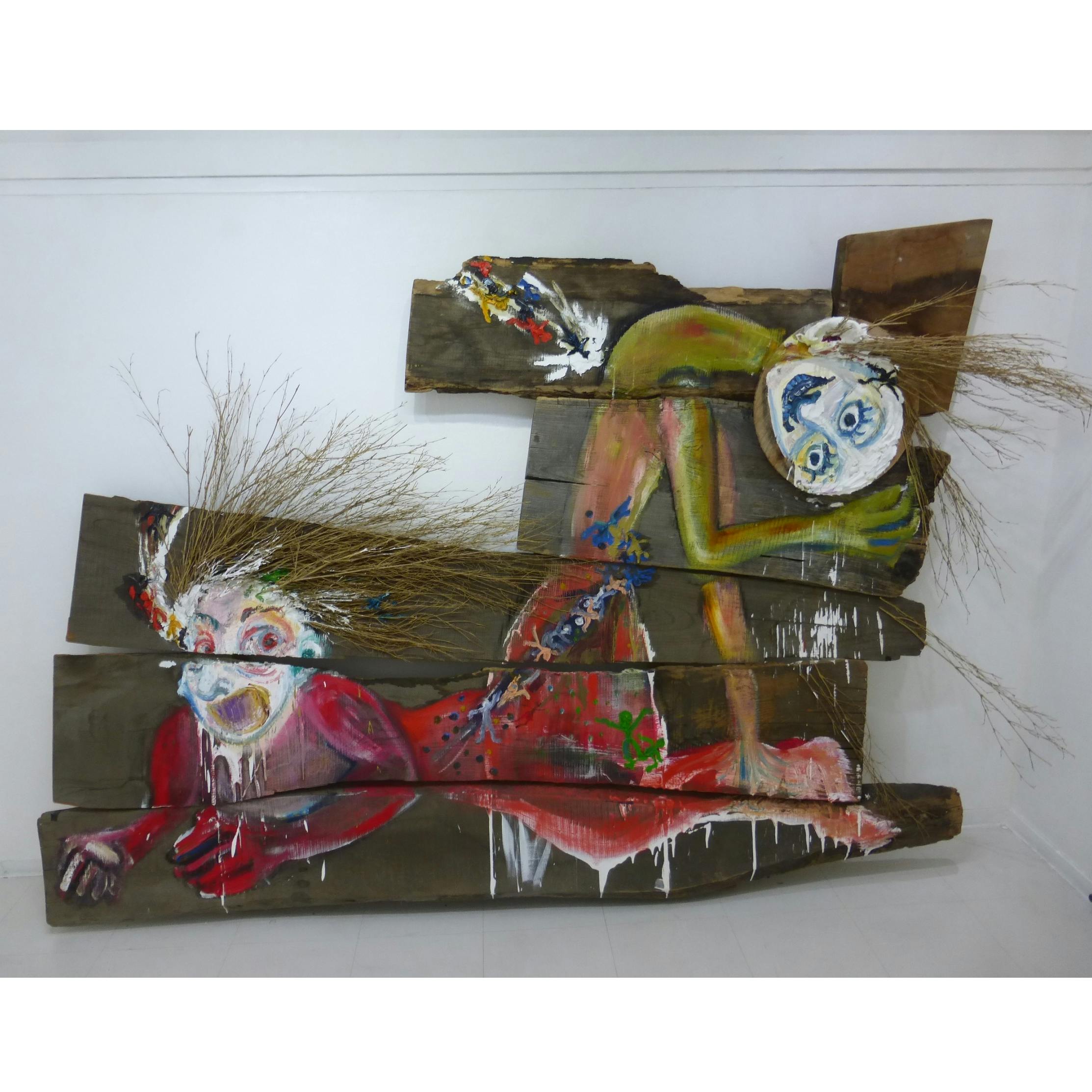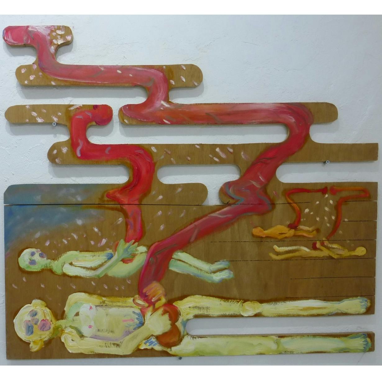 木村有輝子は1990年東京都生まれ。2018年多摩美術大学美術学科絵画学科油画卒業。心の琴線に触れる出来事やふとした瞬間によぎる感情。それらを物語の一部として構成し描くことで鑑賞者の想像力を刺激することを目的として制作している。主にテーマは自身も対象者である「LGBT」について、そして持病である統合失調症から起こる「幻覚の可視化」などである。「LGBT」に対しては偏見がなくならない社会に対して「幸せな恋人像」を描き提示することで救いを見出したいと思い制作している。「幻覚の可視化」は自身が日常に見えたり聴こえたりする幻覚を他者に伝えるために描いたり立体物を制作したりする。近年では、捨てられたモノの命を再構成しもう一度命あるモノに昇華させたいとの願いから、支持体を美大やシェアアトリエから出た廃材などを貰い、様々な素材の持ち味を生かした作品をつくることを試みている。主なグループ展に「Emerging Artists 2016」(Bambinart Gallery、東京、2016)、「何ものでもない私たち展」(DESIGN FESTA GALLERY、東京、2015)など。