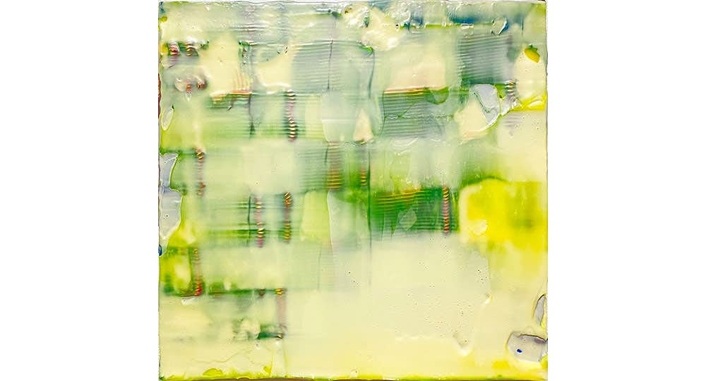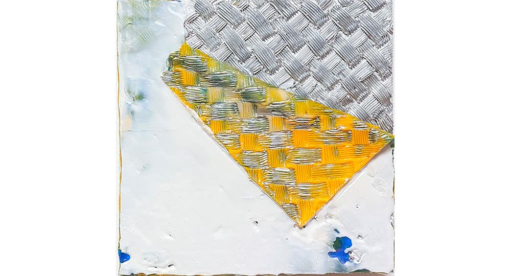 松岡は、絵具の発色や質感の可能性を探りながら、対照的な色や異なる素材が、パネルの上で支え合って生まれる新しい画面の面白さを追求。その作品は、下にチェックや編み込みのような柄があり、その上に色面を重ねることで生まれる多重のレイヤーで構成されている。