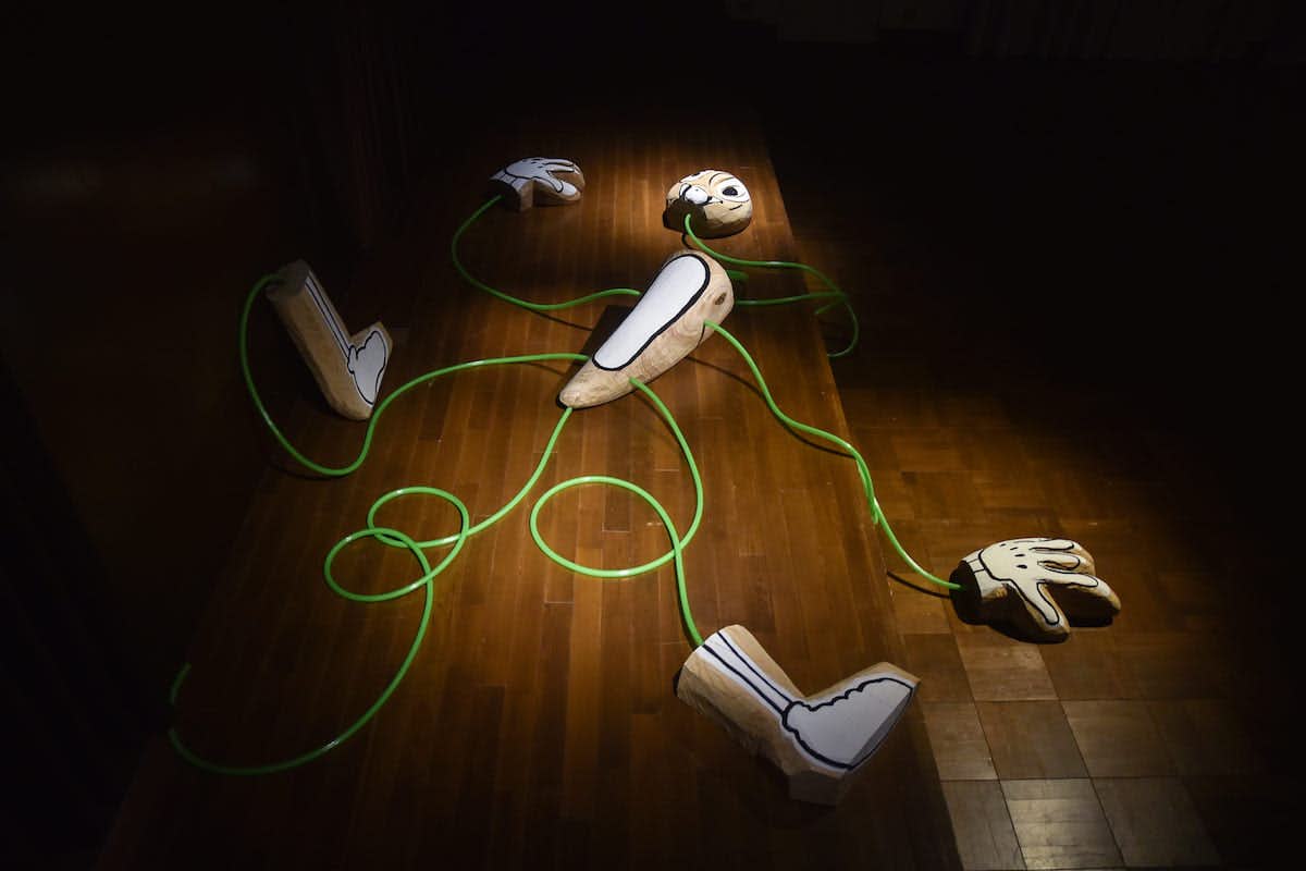 熊野海は、鮮やかな⾊彩を⽤い、煙があふれた現代社会の闇のなかに、カオスとともに暮らしている⼈間社会をペインティングに描写。⾼橋直宏が主に制作している⼈体の⽊彫は、⾝体が断⽚的につながれ、あるいは⽷繰り⼈形のようであり、物理的な制約の下に⼈間をどう考察していくかを問いかける。