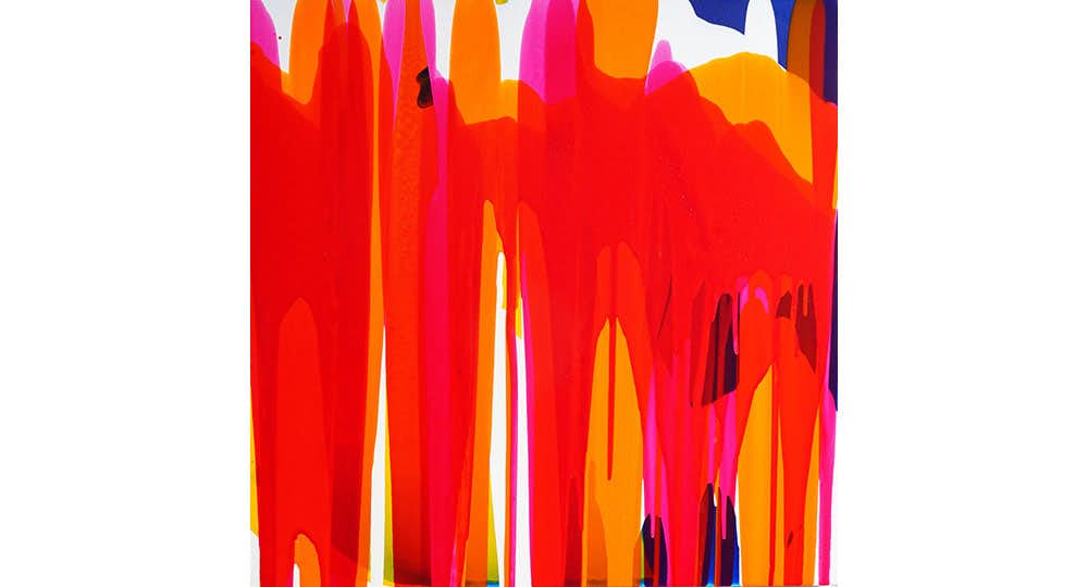 「私は絵画を構成する根源的な要素としての『動き・奥⾏き・光』の3つに加えて、近年は複数のタイムラインを作品に内在させることをコンセプトに絵画を制作しています。⽔平、あるいは傾けたキャンバスに多量の絵具をゆっくりと流し込む⼿法で描いており、絵筆等は使⽤しておりません。重⼒によって描かれた⾊の軌跡、物質としての⾊は多彩な表情を⾒せ、コントロール出来ない偶発的な要素も取り込みながら時間と空間を纏うのではないかと考えています。