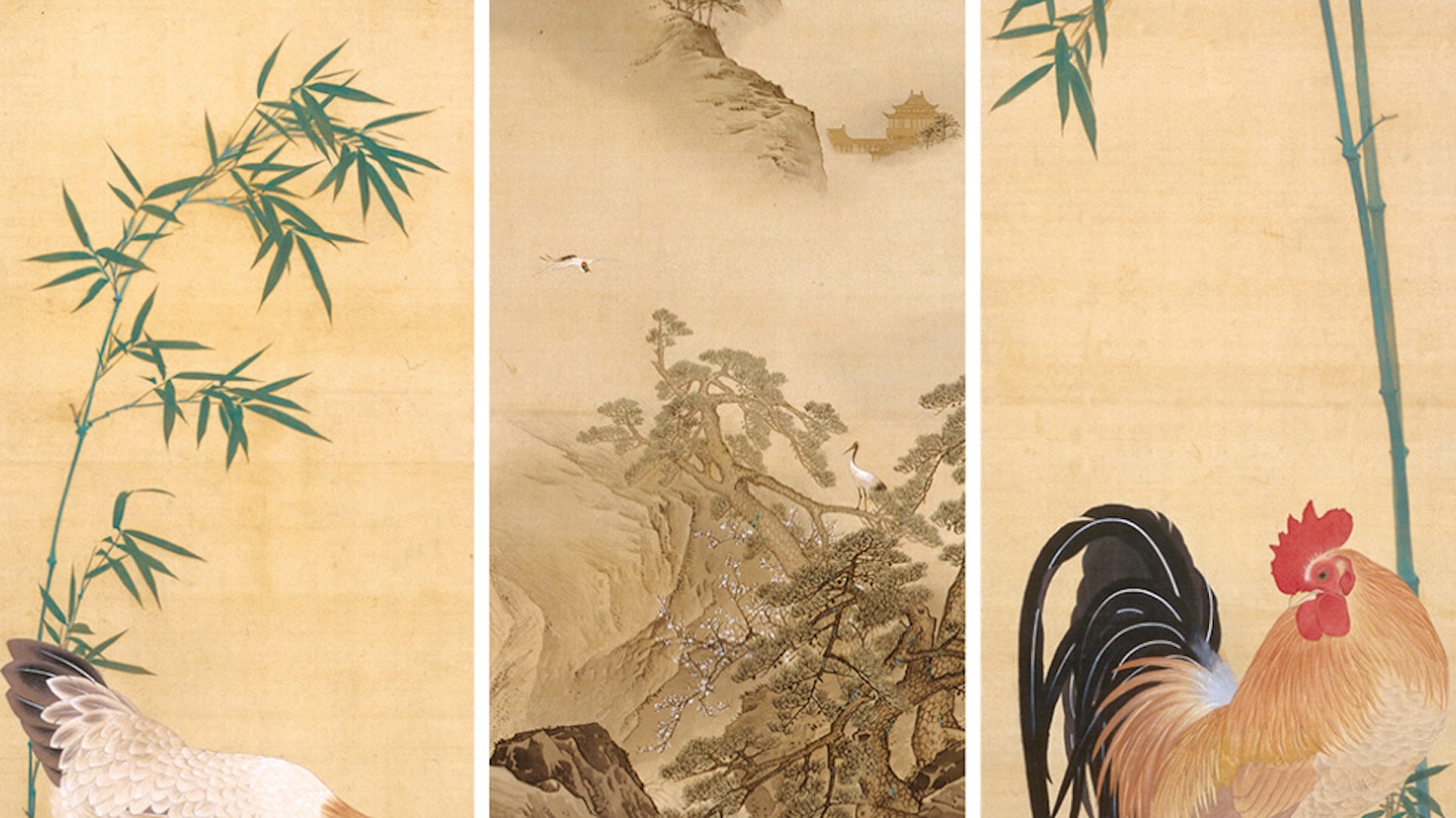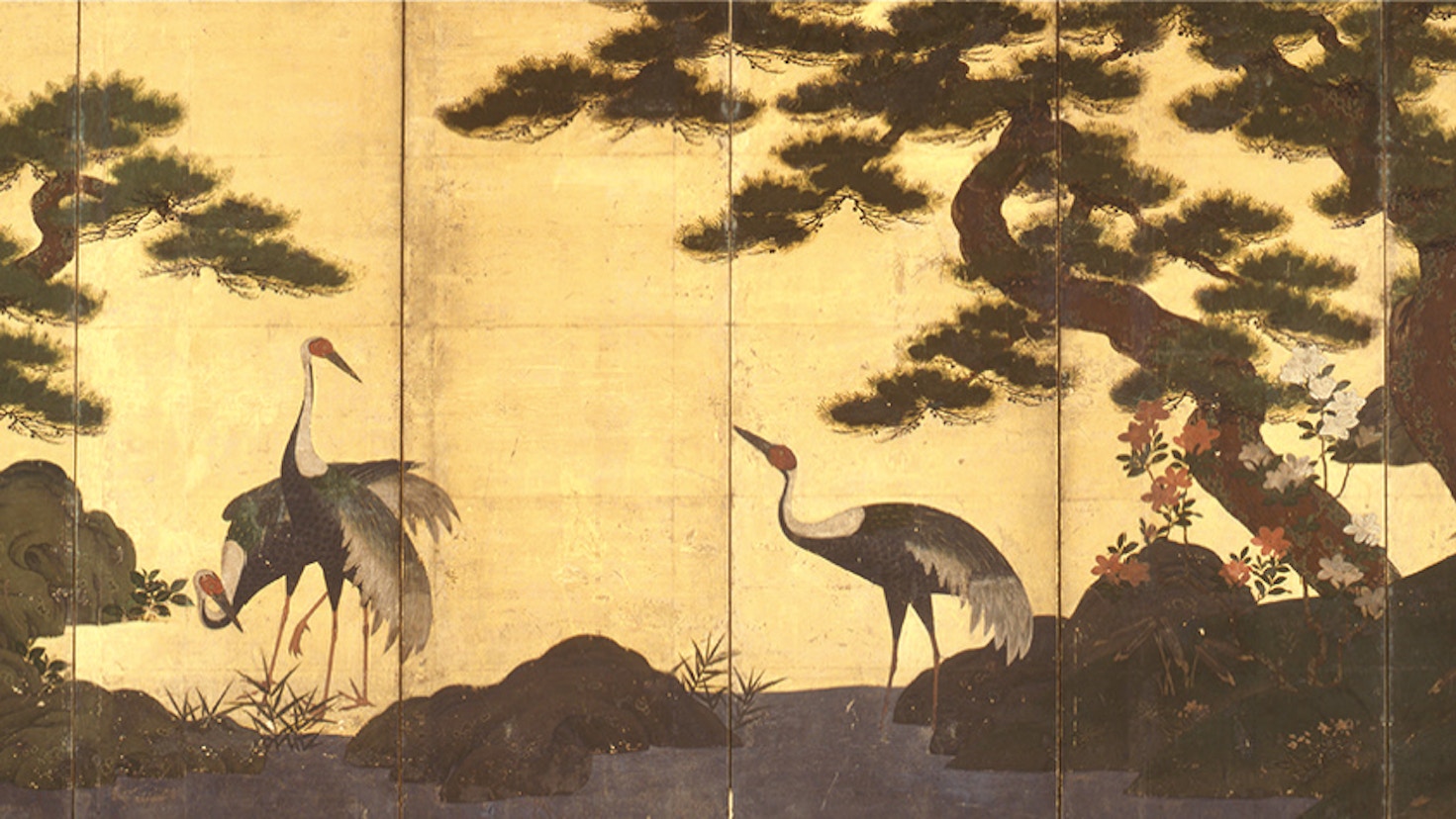 国宝・雪松図屏風の公開にあわせ、三井記念美術館所蔵品の中から「鳥」に焦点を当てて作品を厳選。鳥に関連した茶道具や工芸品、花や鳥が描かれた屏風や掛軸などが並べられる。