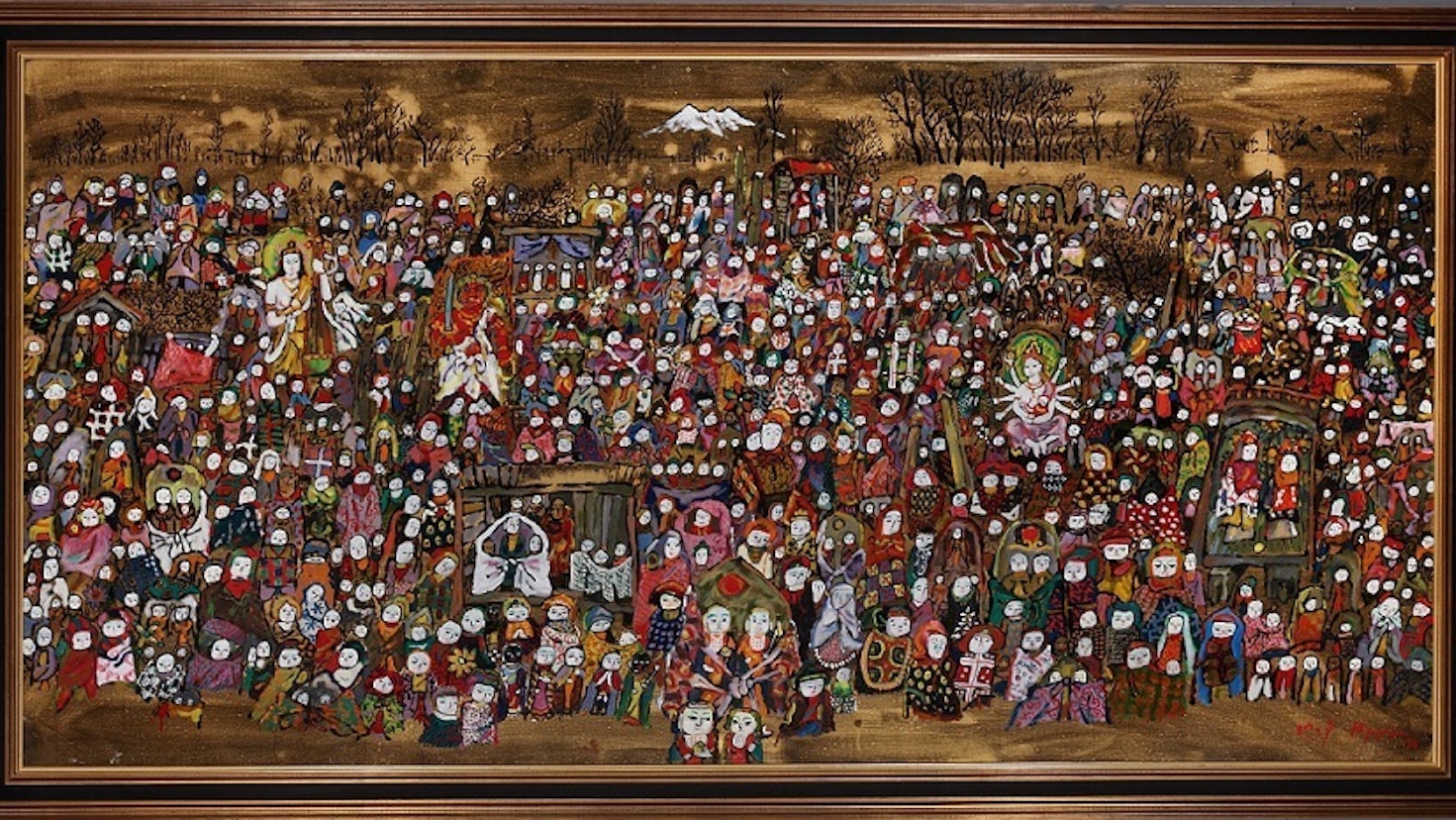 今回のコレクション展は「地と天と」というテーマのもと、大地に根を下ろす力、大地から発するエネルギー、天空への憧憬、天からもたらされる恩恵などを描いた青森ゆかりの作家の作品を通して、青森の精神風土について考えるもの。自らが生まれ育ち、生涯を暮らし、そして還っていくであろう「地」と、限りない可能性にむけて飛びたつことを夢みて仰ぎ見る「天」の、それぞれをめざす精神の運動の軌跡を紹介する。