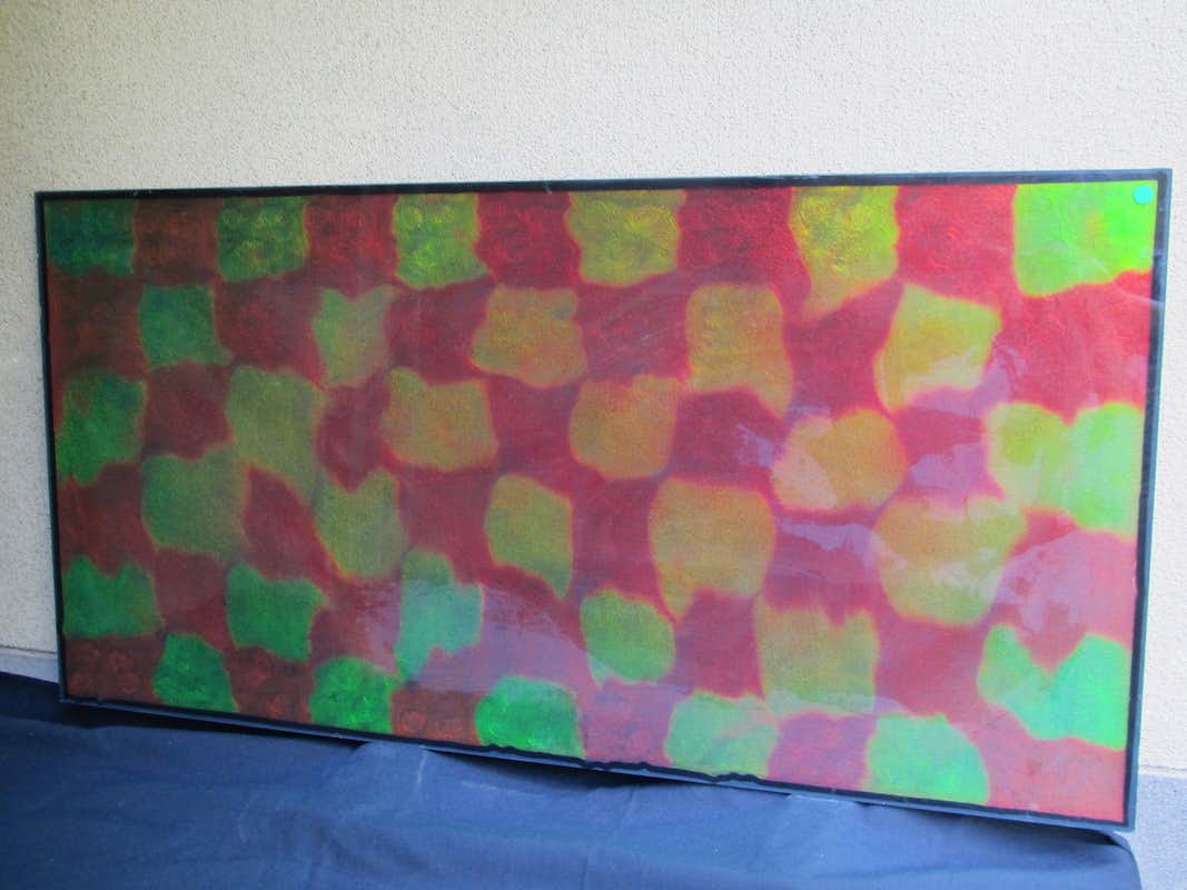「色」を扱う渡辺は、本展で新しい構造色からなる作品を発表。絵具のような面的な表現もできる技法を追求し渡辺が創作した、一対の板ガラス間にカラー液晶を薄く内包した積層体は、視角や温度によて変色現象を生じさせる。これは先端科学技術アートともいえる新たな試みとなる。