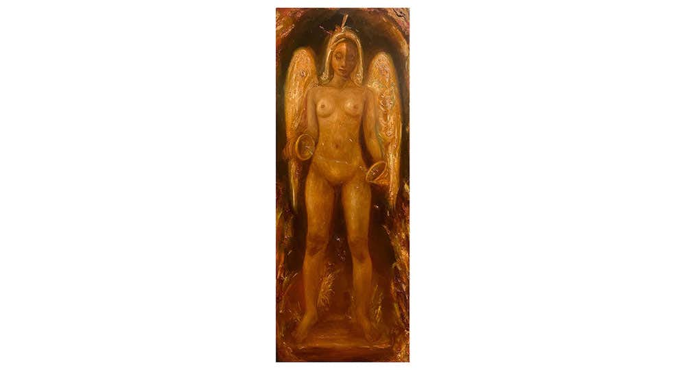 本展のテーマは「娼性」。ギャラリーの1階から3階に上がるにつれ、絵画に描かれた女性たちは衣を脱いでいき、やがて、⽣と死と復活の儀礼を再解釈するような展開になるという。後藤は、古代では娼婦が巫⼥として神聖視されたこと、⽇本でもかつて歩き巫⼥と呼ばれる女性たちがいたことなどにふれ、以下のステイトメント(一部抜粋)を出している。