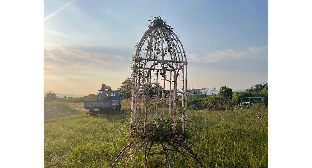 牛嶋は1963年福岡県生まれ。現在、久留米市を拠点に活動している美術家。80年代は身体パフォーマーとしてヨーロッパなどを回った。帰国後、家業の遊具製作所にて働きつつ、遊具の要素を作品のなかに取り入れた「遊具であり、彫刻でもある作品」を制作している。