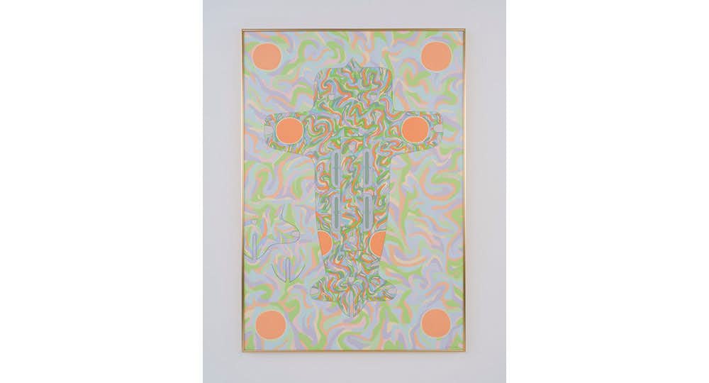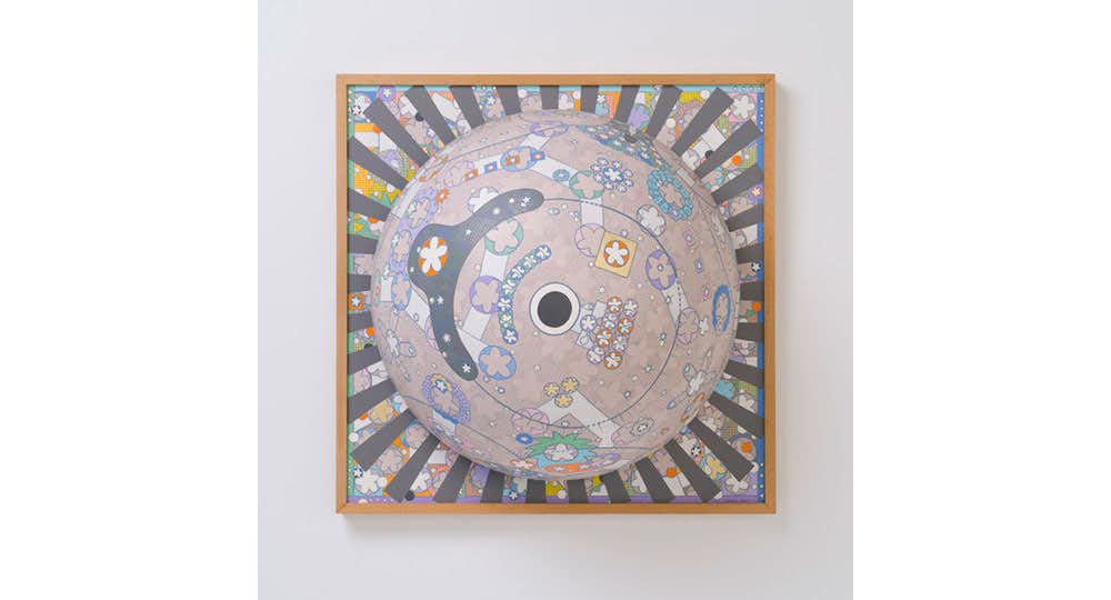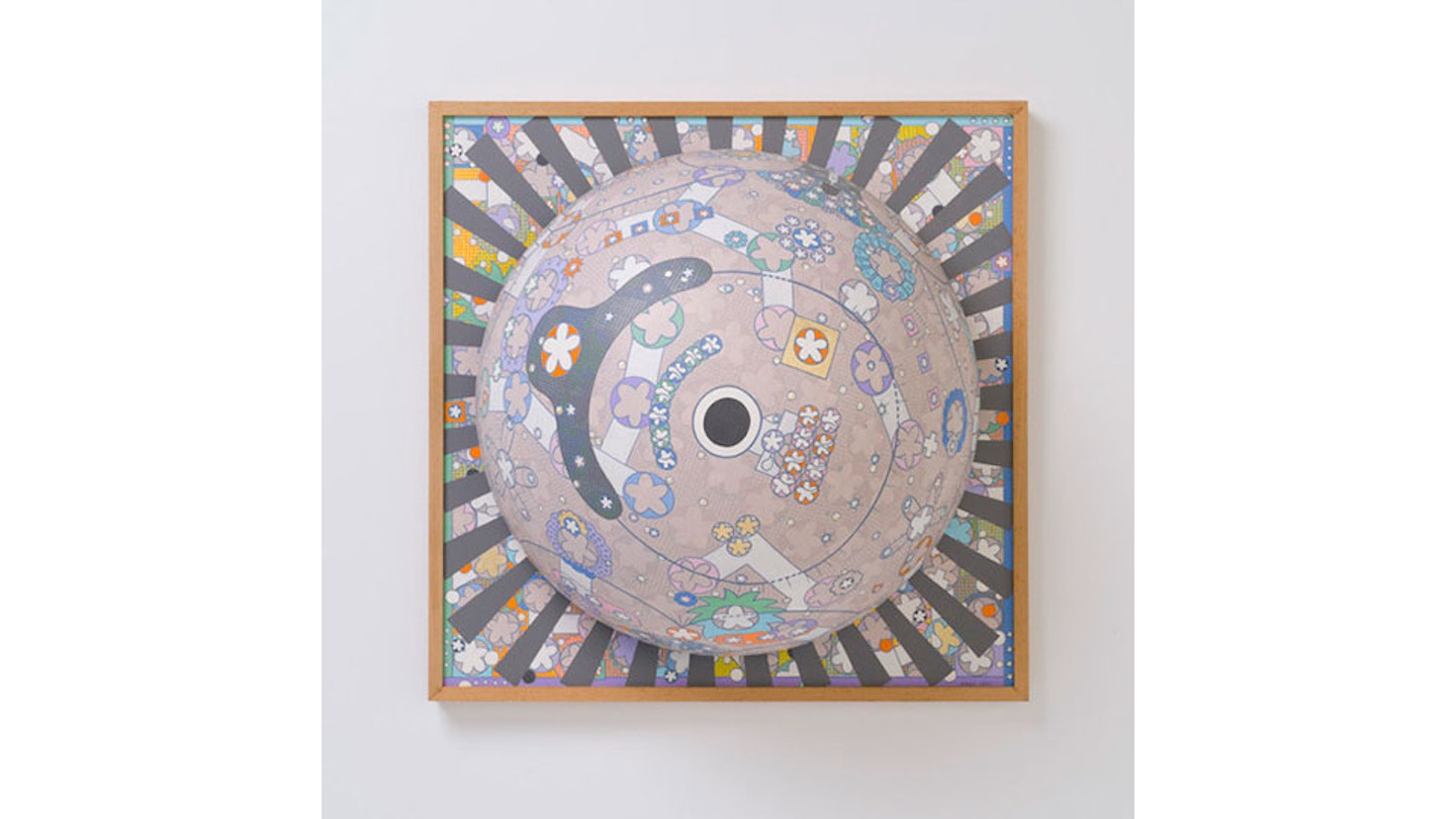 リトグラフやシルクスクリーン、立体絵画、オブジェと、同一のイメージで異なる色・サイズのバリエーションを見せるのが岡本の「おかしんワールド」の真骨頂であり、展示スペースを圧巻のスペクタクルへと転じさせる。明るい祝祭的な画面空間は観客を楽しませながら、迎合しない、台風の目のような静けさもある。