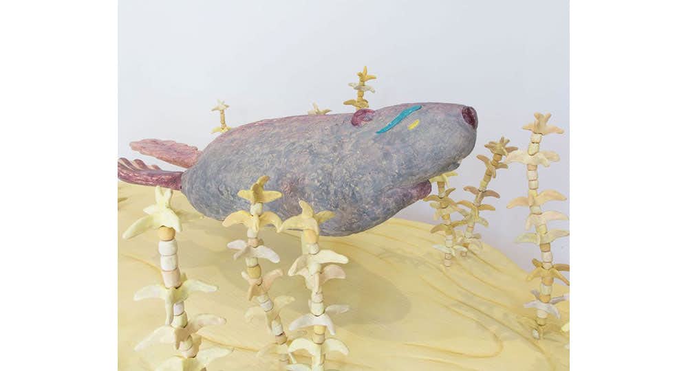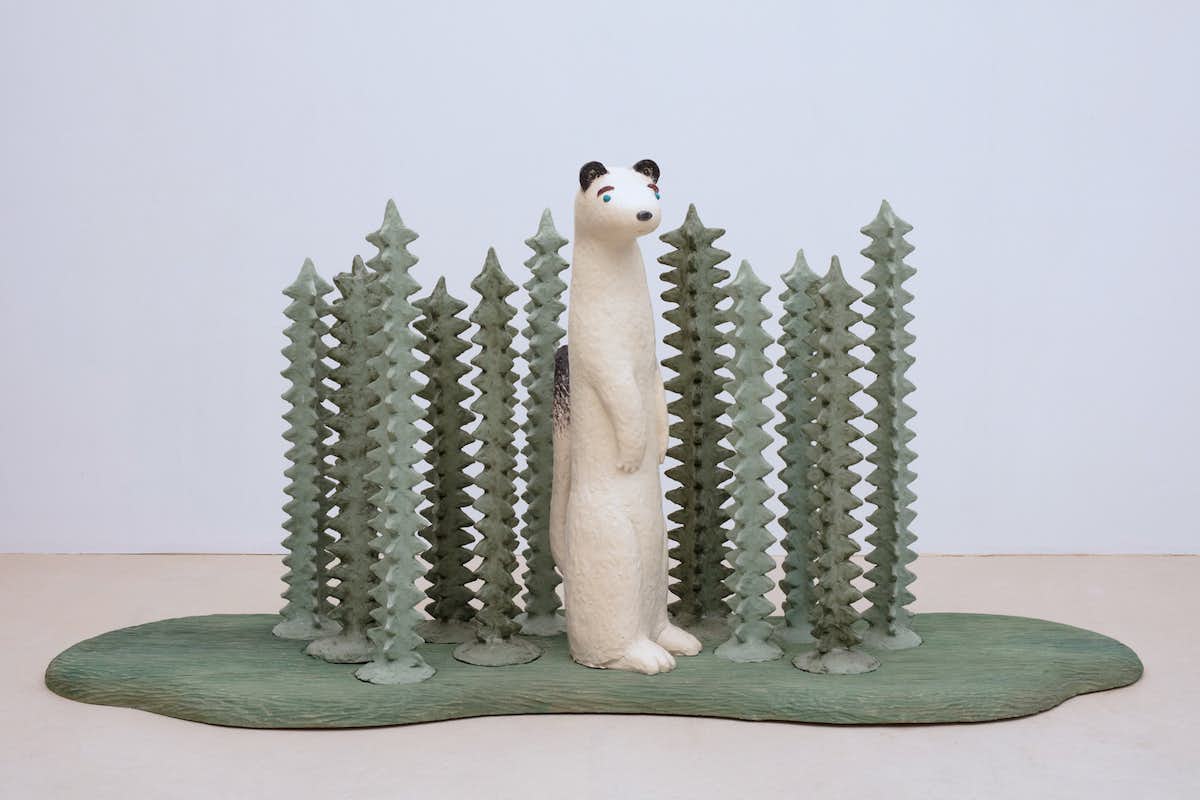 長田の作品づくりは、動物の暮らしやその土地をリサーチすることから始まるという。本展では、アルゼンチン周辺に生息する野生のビーバーに思いを馳せ、その周囲に暮らす鳥や小動物たちのストーリーを紡ぎ出す。展示空間がひとつの宇宙のように広がり、生き物たちが自由な姿でそこに存在する。