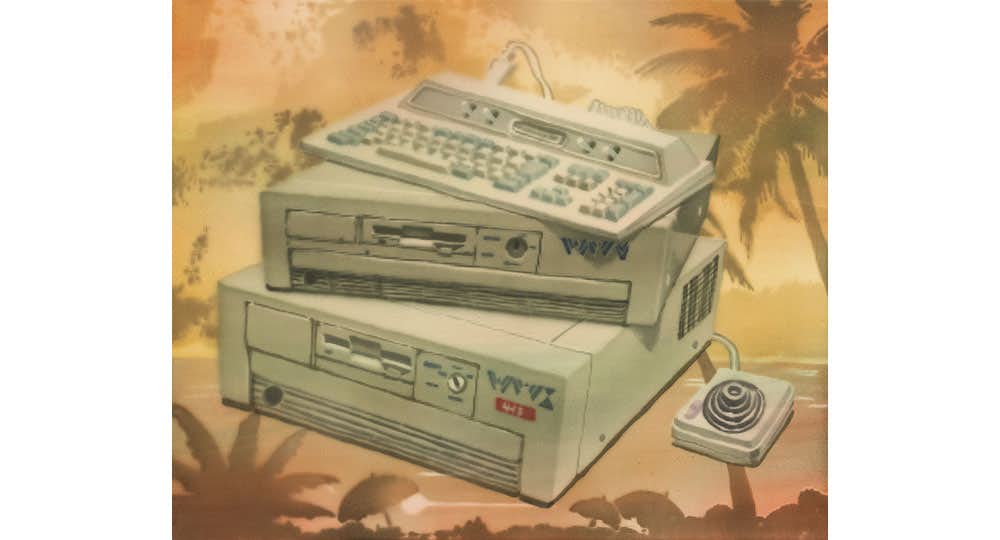 例えば作家が数年来取り組んでいる、1980-90年代のアニメやゲームの⼀場⾯ないし商品広告をもとにしたどこか奇妙なイメージを描いたアクリル画の場合、まず画⾯全体が(低画質ブラウン管の)ディスプレイのように仄かに滲んだ光を放っているように⾒える。だが、それが単なるディスプレイのイリュージョンに終わっていないのは、じっと眺めているうちに画中の⼈物や光らないはずの道具類が発光体と化しているような観を呈してくるからだ。