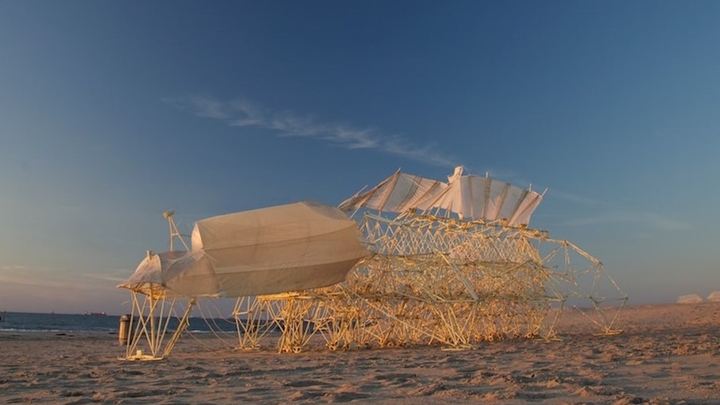 「ストランドビースト」は、オランダ語で、砂を意味する「strand」と生物を意味する「beest」をつなぎ合わせた、ヤンセンによる造語だ。ボディ全体は黄色いプラスチックチューブで造形され、物理工学を基盤としたその動きは生き物を思わせるほどに滑らかで有機的であり、歩行、方向転換、危険察知などの機能を備え、あらゆる環境に適応していくためのシステムを獲得していく。そして作者亡き後も自立して砂浜で生き延びることが目指されている。