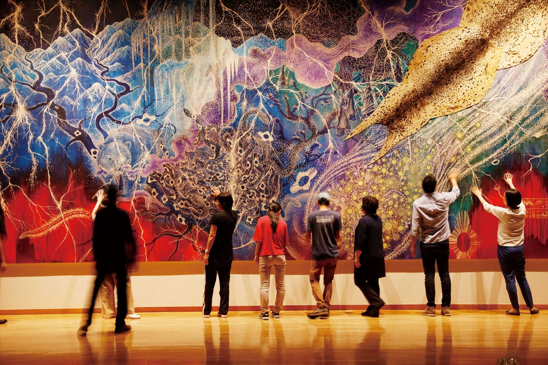 今回、鴻池は生まれたての体で世界と出会う驚きを「みる誕生」と名付けた。観客は眼だけではなく、手で看(み)る、鼻で診(み)る、耳で視(み)る、そして引力や呼吸で観(み)て、美術館という強固な建築と、疎遠になってしまった自然界とに新たな通路を開くことになる。
