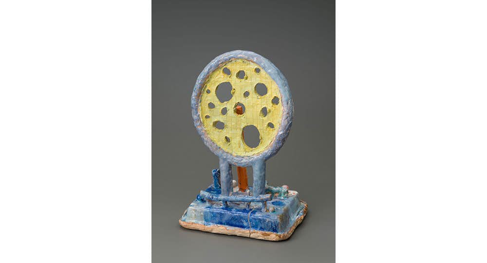 信楽駅口交差点にあるジャズの流れる器のギャラリーショップ「gallery KOHARA」での個展は「器に就て」(7月16日~8月8日)と題し、梅津作品における器へのアプローチに着目。かつてピーター・ヴォーコスは穴の空いた器「アイス・バケット」をつくったが、梅津は器をひっくり返しオブジェの台座に仕立てる。ギャラリーのオーナー・小原康裕は陶芸家でもある。