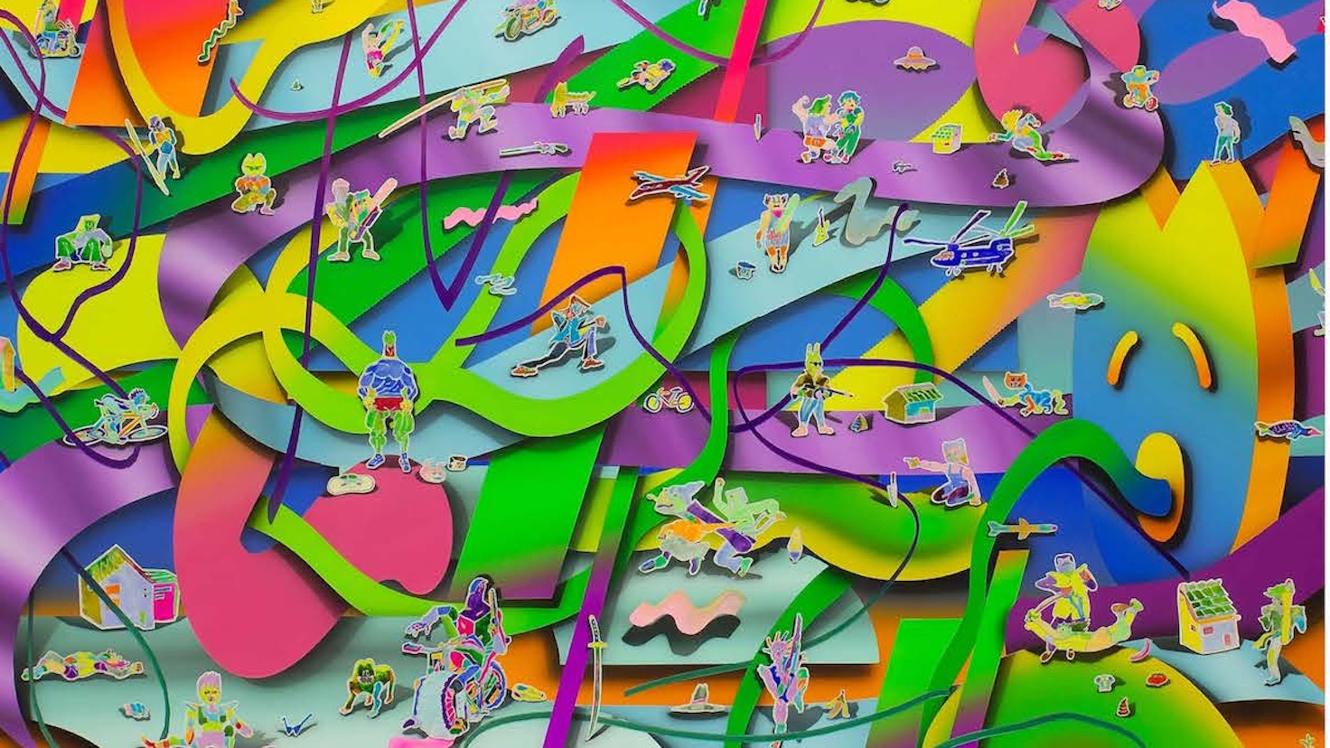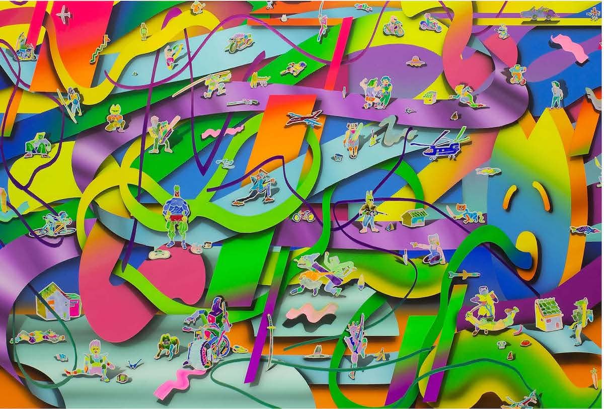 小川がもうひとつの核としているのは、20世紀末頃に隆盛を極めた「セカイ系(*)」だ。「落書き」「セカイ系」の2つの要素で描かれる作品は、エアブラシを用いて描かれ、一見デジタルにも錯覚する多元的な絵画空間がつくり出されている。