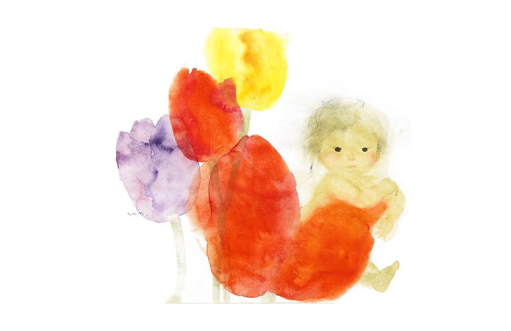 本展では、ちひろの絵本『花の童話集』(童心社、1969)、『世界名作絵本全集14 おやゆび姫』(ひかりのくに昭和出版/改訂版 講談社、1966)、『戦火のなかの子どもたち』(1973、岩崎書店)などのための作品や、《チューリップのなかのあかちゃん》(1971)といった作品を含む、約50点を展示。