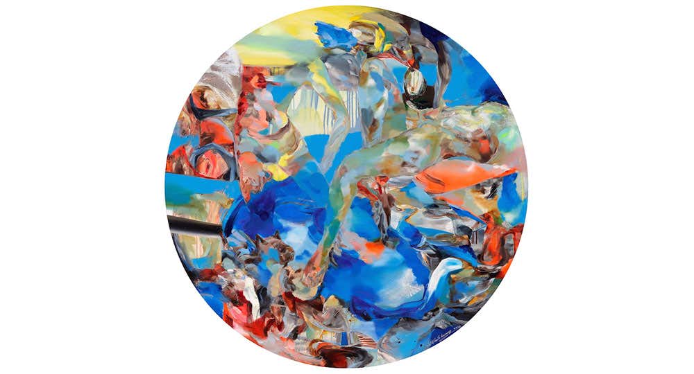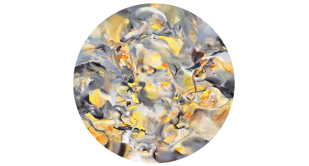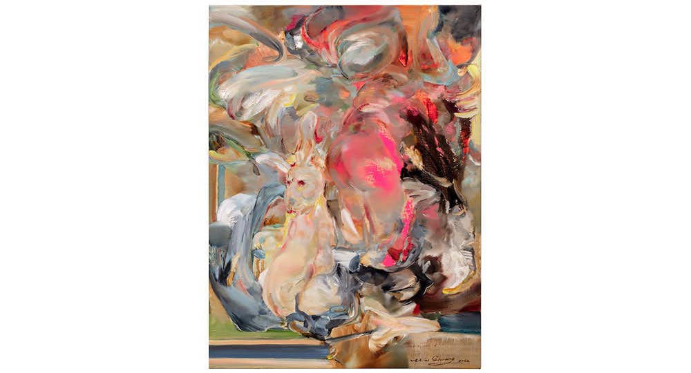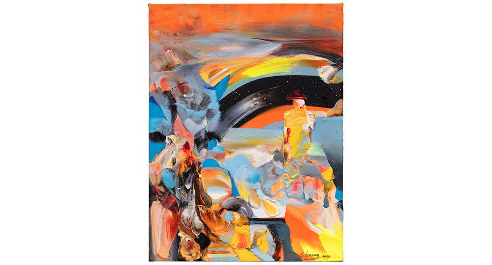 メディウムのひとつである発光顔料が、色彩の強度を際立たせ、混沌としつつも絶妙な調和を見せる色面構成。ウーは、その鮮烈な色遣いと筆勢、またシュルレアリスティックな世界観で鑑賞者を魅了してきた。一見、自由闊達に見える作品は、つねに進化し続ける抽象表現主義に対する追求のもと、綿密な計算と合理性によって成り立っている。