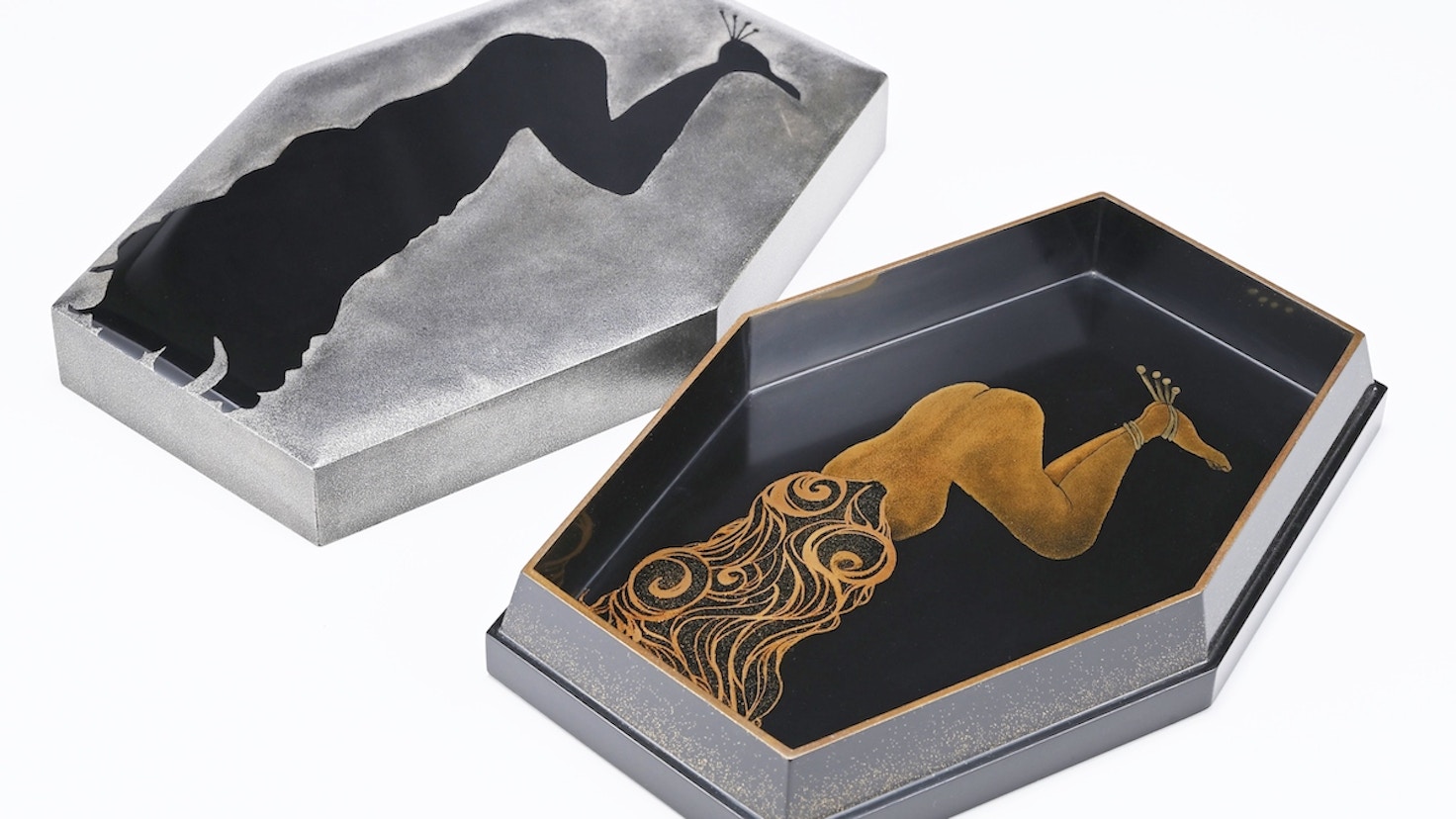 日本文学では、谷崎潤一郎の描く『人の心の光と闇』に魅せられ10年以上研究しています。『刺青』、『卍』、『春琴抄』など谷崎の代表作をテーマにした蒔絵と卵殻技法の漆作品を、生誕記念の『残月祭』に合わせ展示します。蓋の外側と内側を対比し、心の二面性を見出していただけると幸いです(李逸琰)」。
