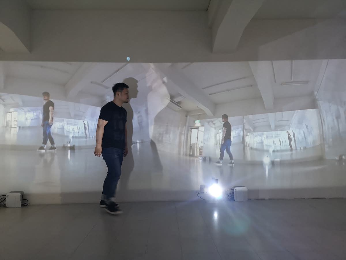 本作は、鑑賞者の動きに反応して撮影されたライブ映像を、複数のプロジェクターが遅延して投影し、鑑賞者を360度取り囲む。鏡に映る姿とは異なる近過去の自分と対面し、映像と影、実像と虚像が何層にも重なって、過去と現在が交錯する空間が生まれる。事前に撮影した映像は用いず、記録することもなく消えていく、その場限りの体験型ヴィデオ・インスタレーションだ。荒瀬は以下のコメントを出している。
