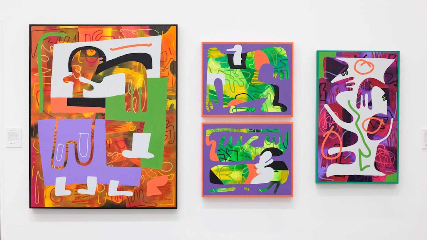 約1年半ぶりの個展となる本展のテーマは「The Me in the Mirror」。複数のキャンバスを組み合わせたペインティング作品、暖簾型の作品、そしてシルクスクリーンの平面作品の、3つのタイプの新作を発表する。