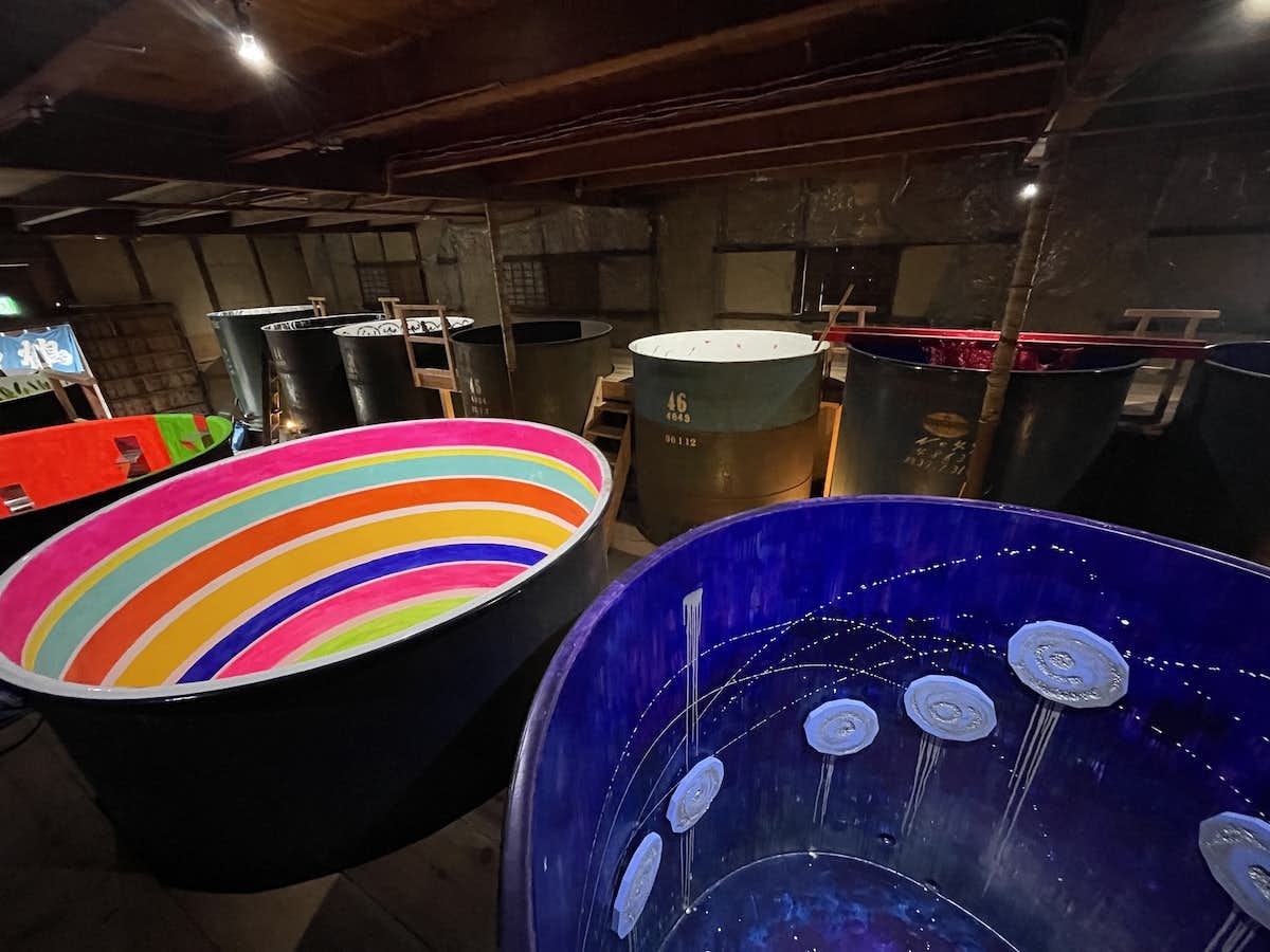 「本蔵」では、酒造りに使用されていた道具や貯蔵樽と共存するようにアート作品が点在。また貯蔵樽の内部には、11名のアーティストが今回のために描き下ろしたペインティングが展示されるなど、元酒蔵ならではの鑑賞を楽しむことができる。参加作家は、Carlos Toledo、Luca Roma、西永拓郎、髙木玲雄、勝川東、クリヤマナオキ、宮岡千賀、kuroma、小野伸介、AKILLER、佐野和真ら。