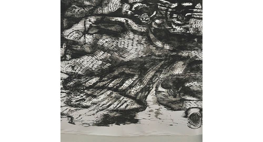 版画を媒体に表現する2人は、版画のプロセスが「境界」を越える行為に極めて近いものではないかと考えている。「シルクスクリーンでは、刷りによってインクが版を越えることでイメージが現れ、木版画では和紙と版木とが接しながら、墨によって互いの内部へ侵食し合うようにイメージが摺りとられます。何かについて理解しようとするために、まずそれらと自身を隔てる『境界』を意識し、それを越えて外側へ向かうのだとすると、外と内とを区別する過程で、内側である自身について改めて考える必要があります。この外と内との往還に、版画との共通点を見出しているのです(中桐聡美・山田真実、本展ステイトメントより)」。
