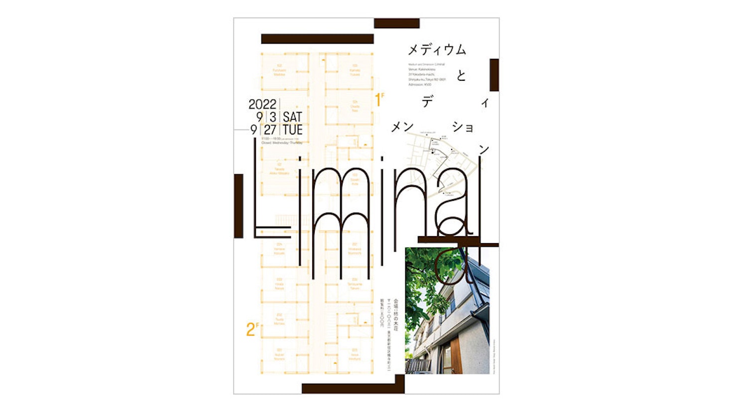 美術評論家・中尾拓哉によるキュレーション展「メディウムとディメンション:Liminal」が開催される。築50年の木造アパート「柿の木荘」の改修と、その「前/後」にまつわる展覧会。