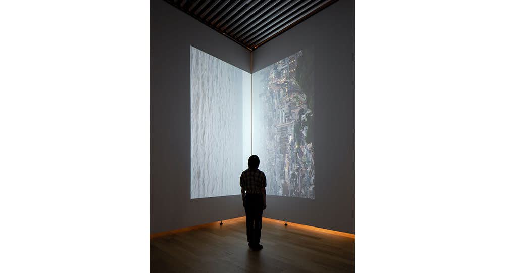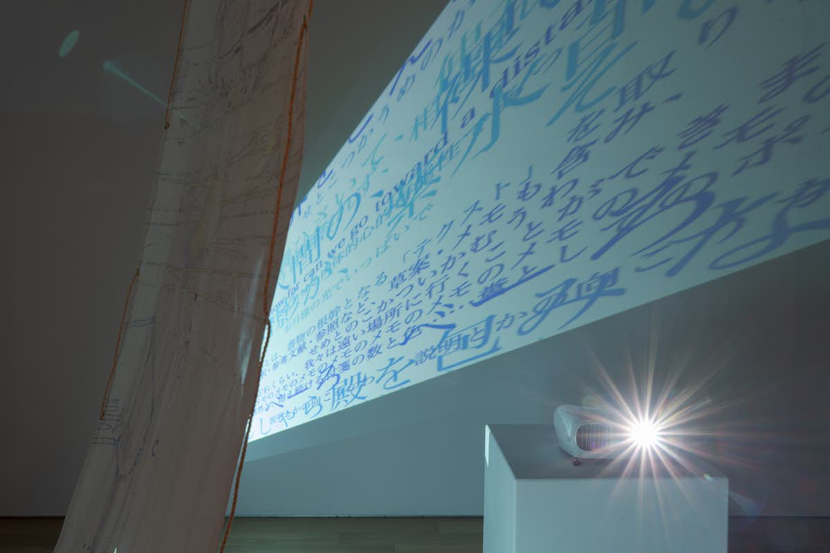 本展では、「図書館とは世界の模型であり、世界は永遠に完成しない一冊の巨大な書物」と空想する中野が、図書館を併設する不知火美術館において、不知火海や熊本にまつわる文学や芸能をリサーチして創作した新作を発表。不知火美術館の展示室空間を大胆に使い、複数の映像と巨大なドローイングを交錯させ、「読書体験」を美術館で生成変化させる新感覚の作品を展開している。