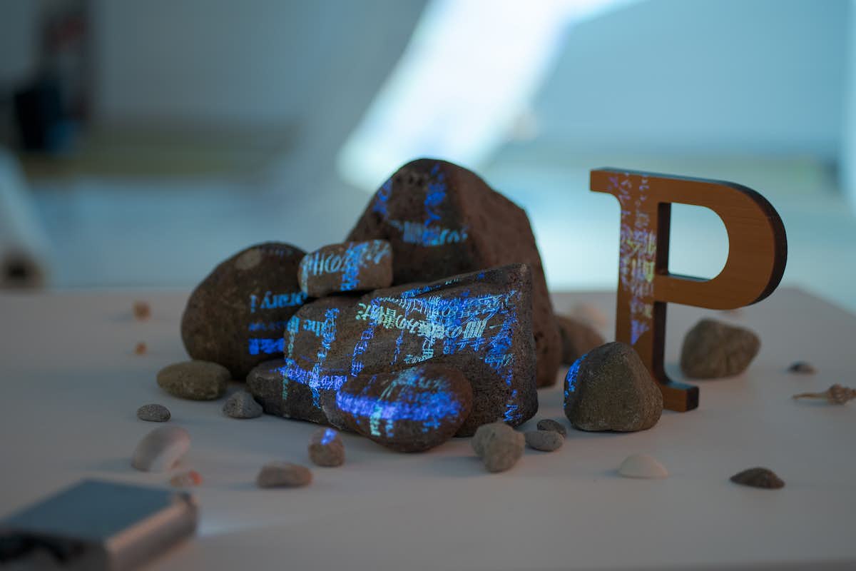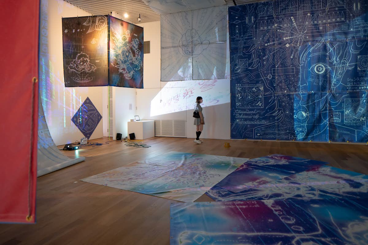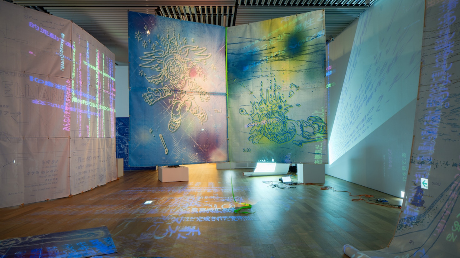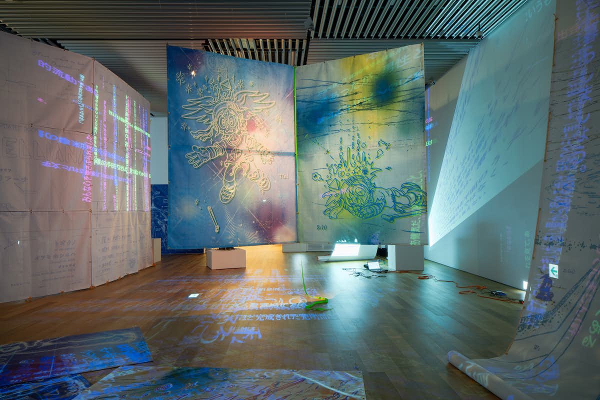 中野裕介/パラモデルは、書物やマンガ、古典芸能など古今東西のテキストや語りの言葉を猟歩し創作を行っている現代アーティスト。その展覧会「かなたをよむ:海と空のあいだのP」が熊本県の宇城市不知火美術館で開催されている。図書館と美術館を併設する同館だからこそ実現した「本×美術館」の展覧会。