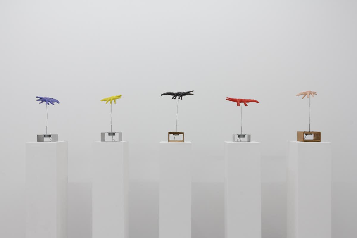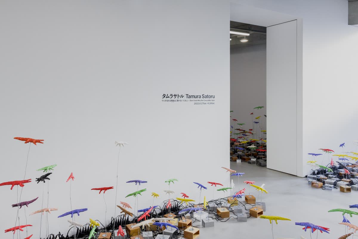 青やオレンジ、白など様々に彩られ、20センチから12メートルまで幅広いスケール感で制作されるワニたち。タムラのキネティックな彫刻は電気や工業素材を利用しながらも、まったく非生産的であることが特徴だ。その芸術実践に通底するアイロニックな無用さには、生産性や効率に固執する現代社会へのさりげない皮肉が含まれている。実際、タムラの作品は明確な芸術的目的すら提示しておらず、芸術の役割や意味に対する鑑賞者の固定観念を覆す。