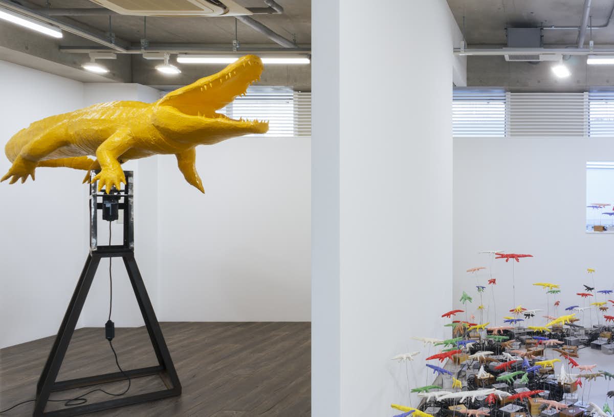 本展では、MAKI Gallery(8月27日~9月24日)とTEZUKAYAMA GALLERY(9月16日~10月15日)の2会場で合計1000匹以上の「まわるワニ」が展示され、彩りと動きの爆発が、見る者を非現実的なダイナミズムで包み込む。