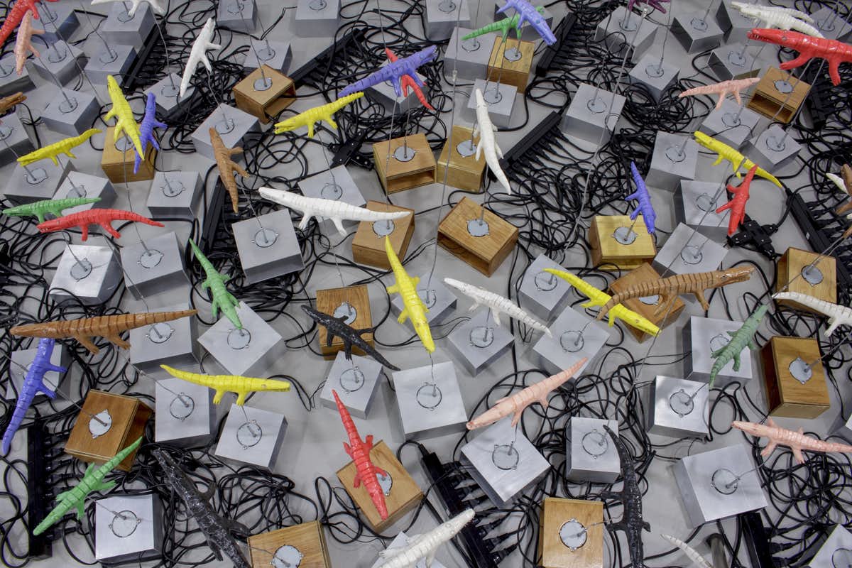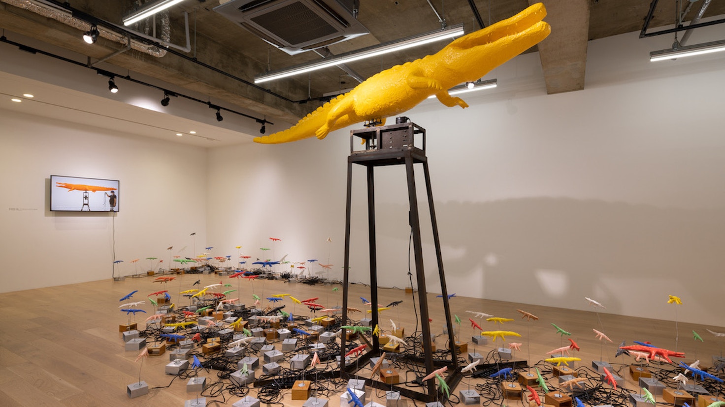 タムラのワニは電動の機械装置にも関わらず、作家自身の手で一つひとつ形成されている。そしてユニークな名前をつけることにより、作品は独特な温かみと個性を宿す。南堀江と表参道の2会場で並ぶのは、合計1000頭以上のワニたちだ。それぞれが回転し、彩りと動きの爆発が、鑑賞者を非現実的なダイナミズムで包み込む。