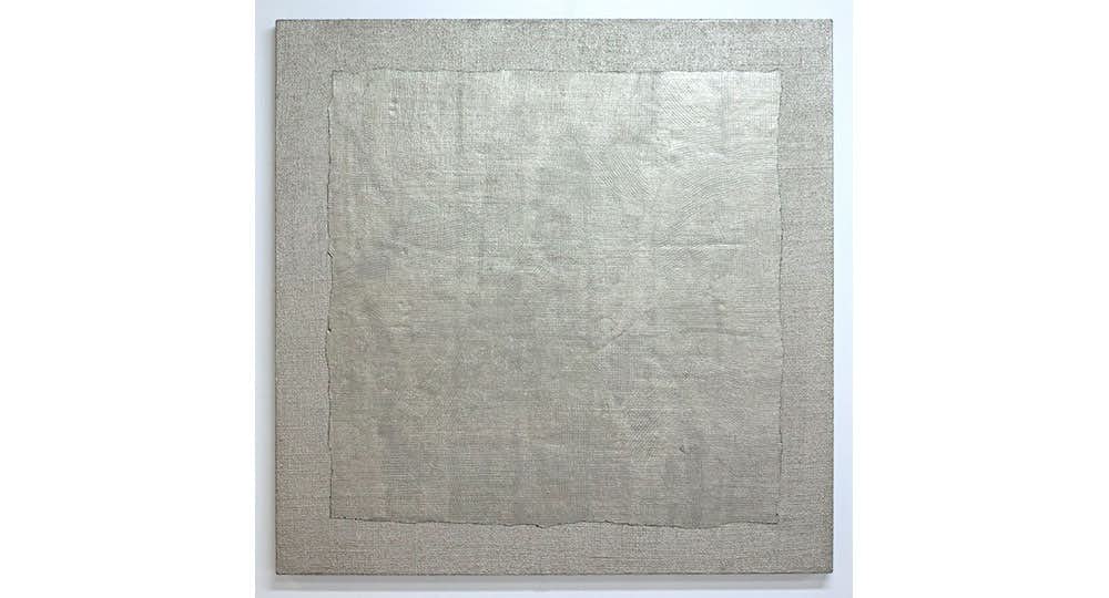 吉岡は1993年兵庫県生まれ、2017年に京都造形芸術大学(現・京都芸術大学)芸術研究科芸術専攻ペインティング領域を修了。品川とは対照的に、描画材による凹凸が見つからない吉岡の作品は、キャンバス生地からかたどったシリコン型にペインティングし、「キャンバスの複製」をとってパネルに貼り付けるという、インダストリアルかつ絵画的な技法がとられている。