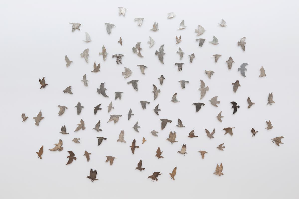 3階のメインギャラリーでは、インスタレーションの要素を持った285×350センチメートルの大型組作品《マーミュレーション / MURMURATION》を展示。「マーミュレーション」とはムクドリの群れを指した言葉であり、本作では金属でつくられた無数のムクドリの群れが、壁一面に羽ばたく。テイラーは次のように述べている。「ムクドリはもともとヨーロッパに生息していた動物で、ほぼすべての大陸に持ち込まれました。そして、ムクドリは私たちが作る都市環境を受け入れて、そこで生活をしています。人間が人新世(人類の時代)のもたらした変化と向き合う中で、私たちとともに適応してきたさまざまな存在があるのです」。