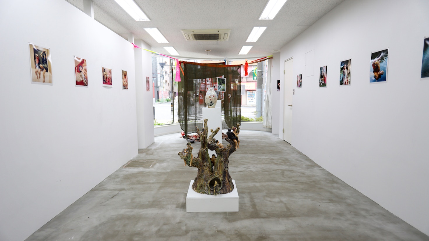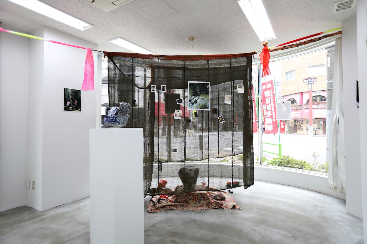 本展で⽯橋と⼟屋の2人は、ウッドマンの⼀連の作品を引⽤。ジェンダーやクィアネスといった領域をはじめとした、社会規範の揺らぎが増⼤するなかで、現代における社会への態度を⾊濃く⽰す。展⽰のなかでは、妖怪や怪談、⾃然、お⾯、蚊帳といった⽇本的なモチーフが、撹乱的かつ挑発的な⽅法により、暴⼒性とユーモアをまとって提⽰される。