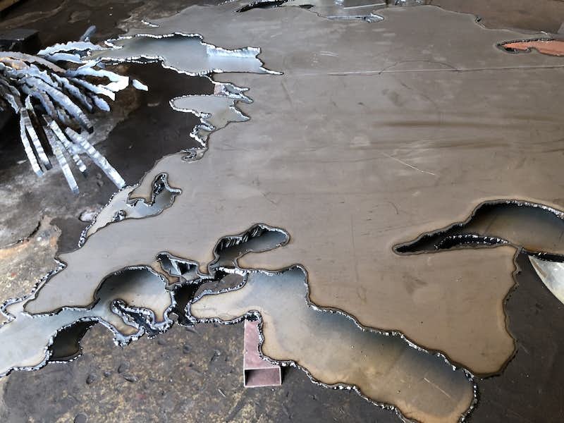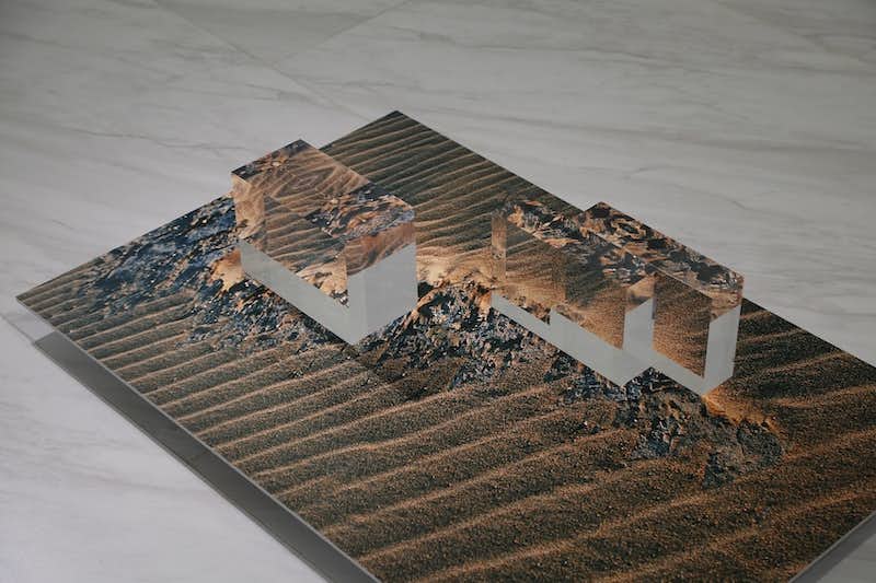 本展で八木マリヨは、地球の創生に関わる鉄を材に選び、地球生命と人間の未來の道筋を探究する新作を発表。八木夕菜は地面を敷き写すシリーズを展示し、最新作は悠久の時を経た地球の表情の現在形を思わせる。