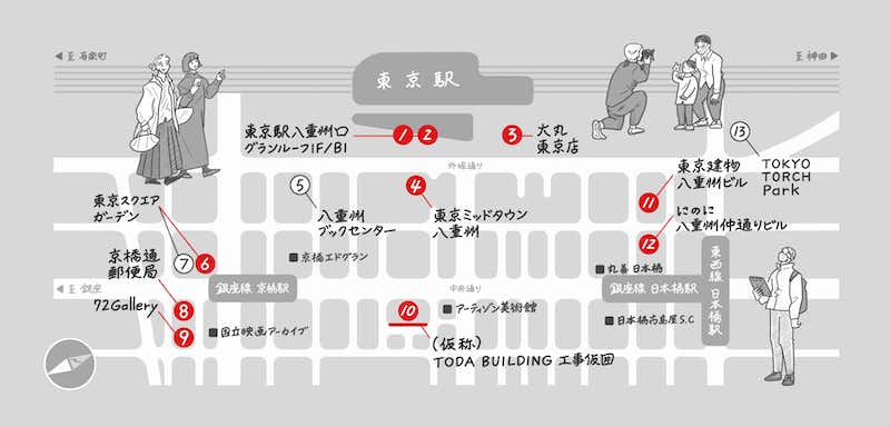 会場は東京駅八重洲口グランルーフ1階、東京駅八重洲口グランルーフB1、大丸東京店、東京スクエアガーデン、京橋通郵便局、72Gallery、新TODAビル計画仮囲い、東京建物八重洲ビル、にのに八重洲仲通りビルほか。過去最多となる13ヶ所で行われる。