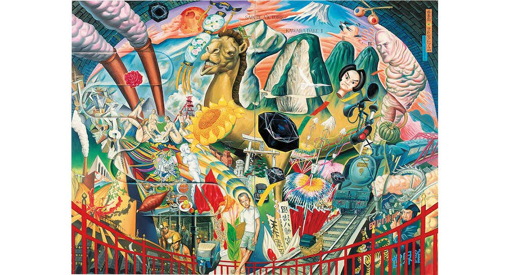 本展は、美術を介して鉄道史を振り返るもの。1854年にアメリカより贈られた蒸気機関車の模型を表した画巻から、日比野克彦が2021年にデザインした電車のヘッドマークに至るまで、近現代鉄道絵画の傑作が勢揃いする。