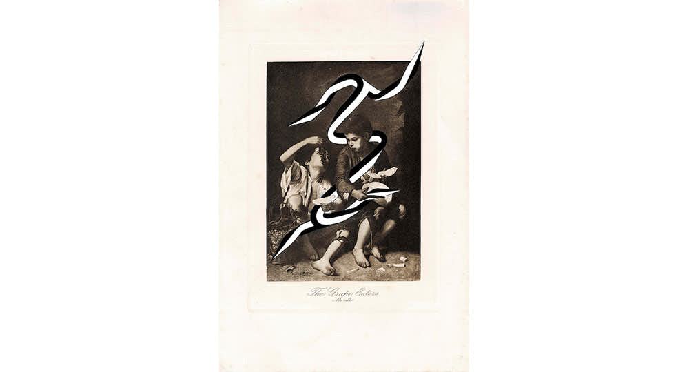 「Found Object」シリーズはまた、刷られたイメージだけでなく、印刷物というオブジェクトに対する時間的な介在でもあるという。《葡萄とメロンを⾷べる少年たち》は17世紀にスペインで制作されたが、⼤⼭が今回⽤いたのは、19世紀の英国でそのイメージを印刷した版画だ。イメージの有名性に⽐して、オブジェクトそのものは「美術史上の絵画作品を複製した無名の印刷物」といえるが、⼤⼭の仕事は、こうした埋没したオブジェクトに光を当て、現代美術というアクティブな産業構造のなかで新たな美学的、経済的価値をもたらそうとしている。