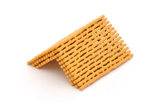 磁器土を一滴一滴スポイトでたらしながら「粒」の集積によって、幾何学的な形や、建造物のような形に仕上げるさかぎしよしおう。形成されたのち釉薬がかけられ、三度焼かれると、手のひらですっぽりと覆うことができるサイズの作品が出来上がる。