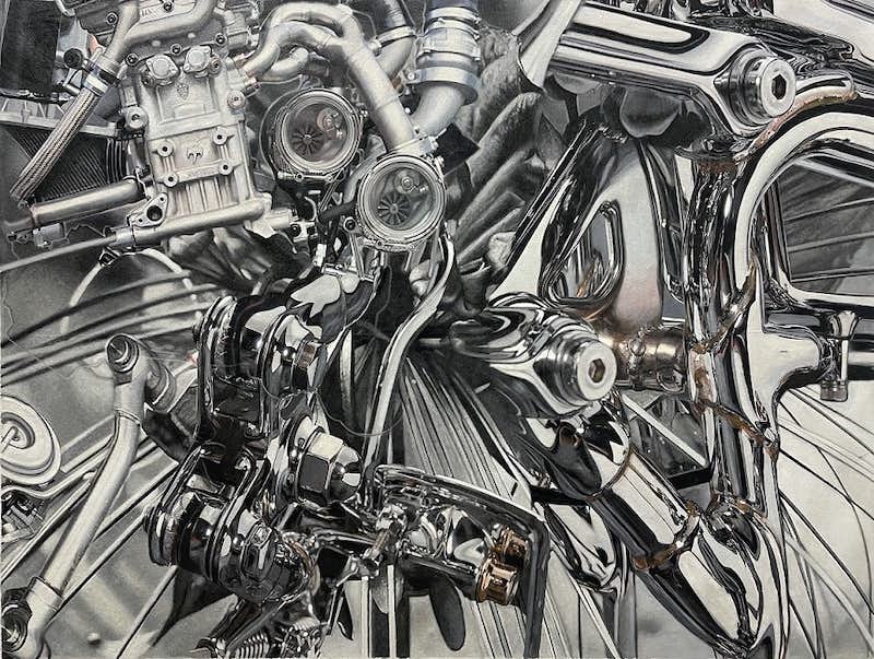 牧田は現在、主にニューヨークを拠点に活躍しているアーティスト。金属やプラスチックでできた工業製品のイメージをコンピュータで編集し、有機的なイメージをつくり、それをキャンバスに絵具で手描きするという精緻な制作手法をとる。機械のエンジンパーツが持つ動的な物質感、生物的な流線型の艶かしさ、光の反射によって空間に反復と拡張をもたらす絵画は、鑑賞者の感覚・知覚を揺さぶる。