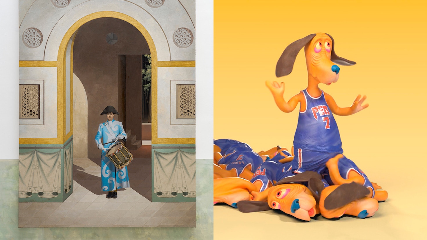 ヒダカは、空間をシンメトリーに等分し、ピカソのアルルカン、フラアンジェリコのディテール、スカルパのフレーム、カービーのダイアグラムなどが反復する時空を超えた不思議な散策を、並行する戯曲のように提案する。いっぽうムラタは本展に際し、最新の技術であるWeb3.0やNFTによってもたらされるメタ世界への興味から、バスケット・ボールをする「ラリー」という犬の映像作品を制作。液体シミュレーターでレンダリングされたラリーは、彫刻のように見えるが、メタ世界にしか存在しない、バーチャルなムラタの自画像としても示される。