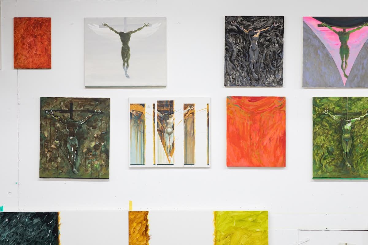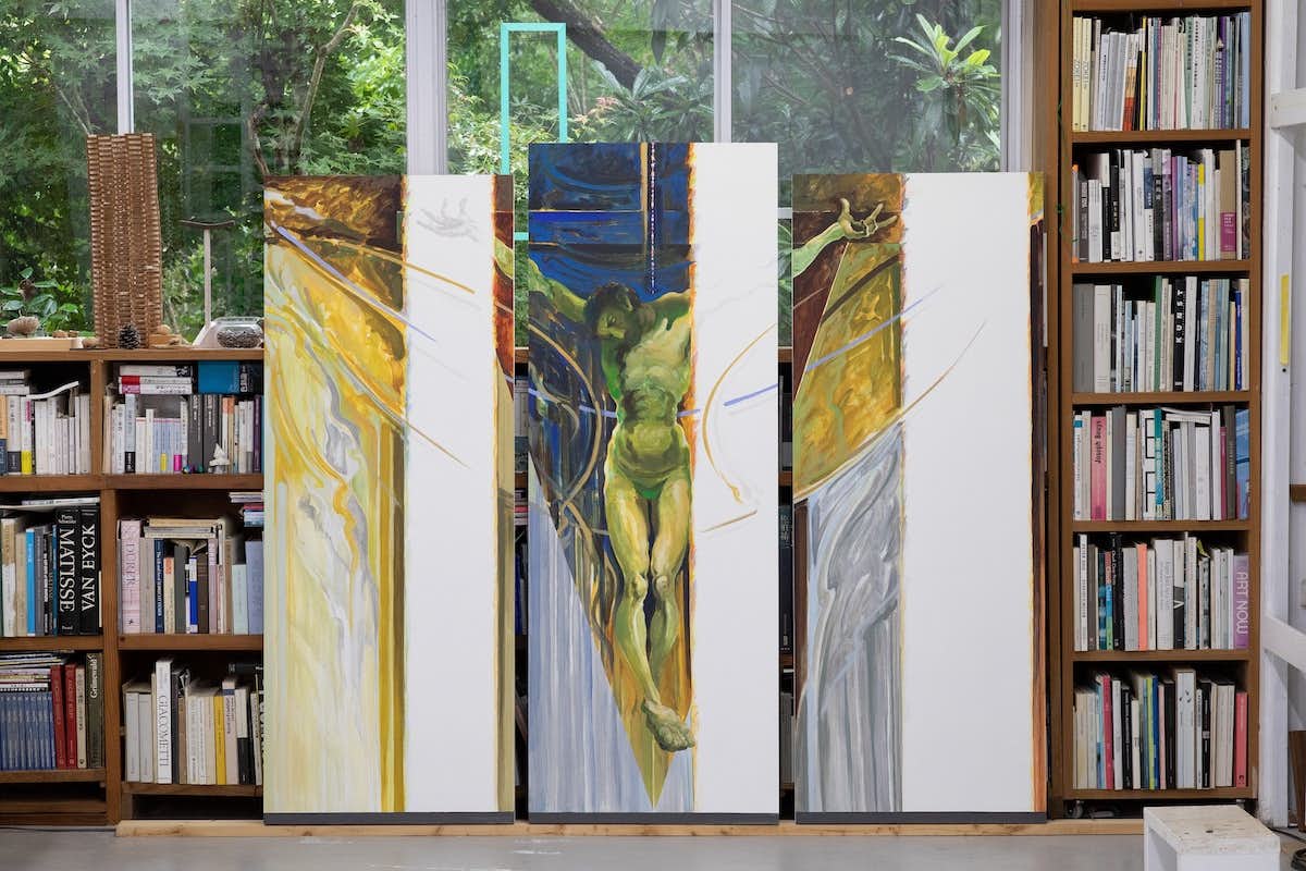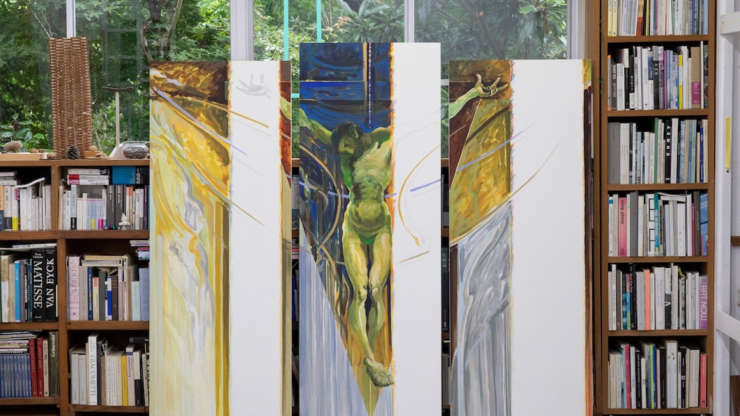 そうした形式を自らの絵画制作の実践で検証する過程で、16世紀初めにグリューネヴァルトが描いたイーゼンハイム祭壇画の《磔刑図》を参照しつつ、《ta・KK・ei》(1998)を制作。長い歳月をかけて、障壁画に着想を得た偶数の画面が連結する横長形式の「〈TA〉系」、西洋のイコンや仏教美術などの精神性を正方形の画面に構成した「〈Qf〉系」といった作品を展開し、自身の絵画理論を深め続けてきた。