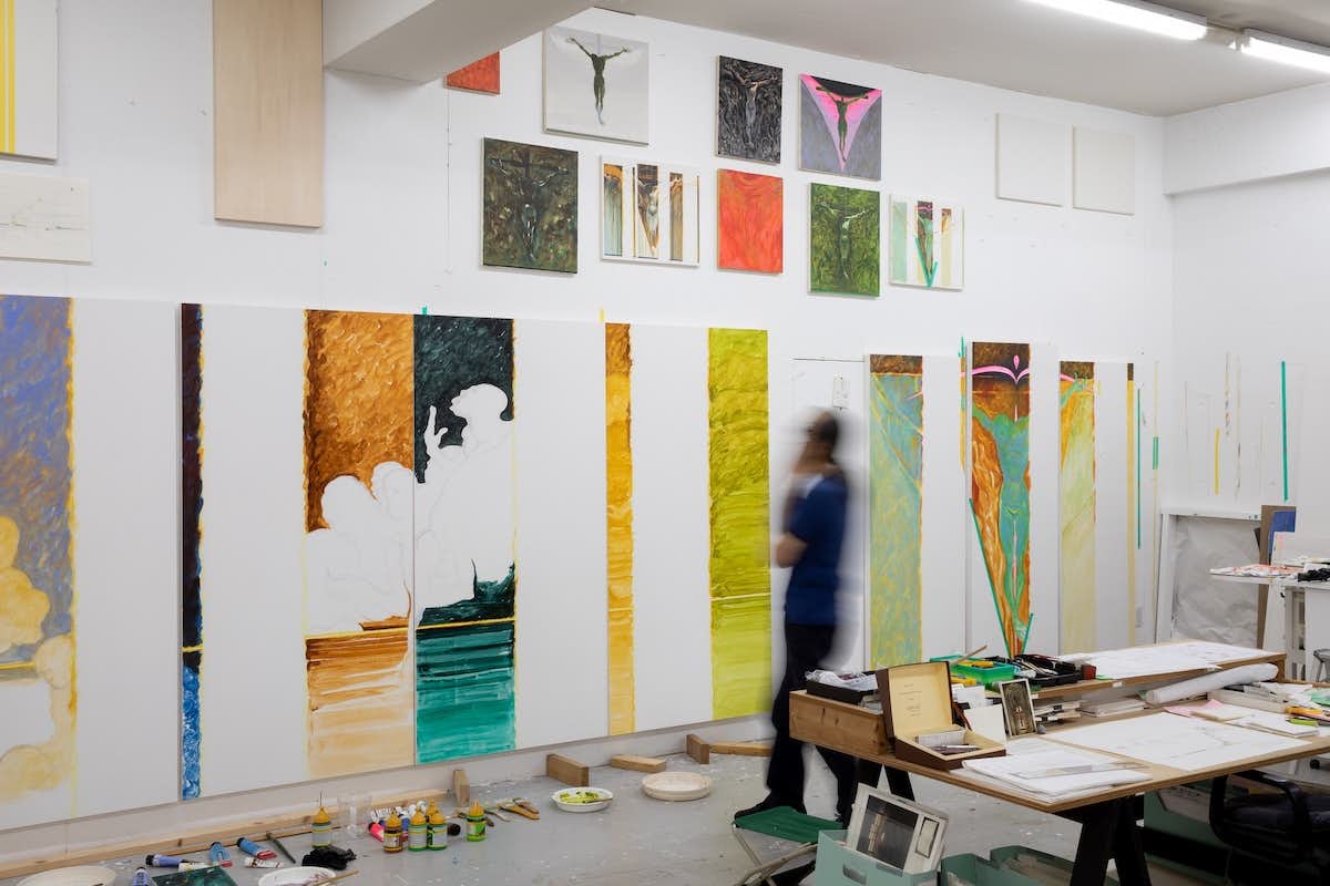 母袋は1954年長野県生まれ。78年に東京造形大学美術学科絵画専攻を卒業後、83年にドイツ・フランクフルト美術大学に留学。ドイツ滞在などを機に、日本の建築空間における障壁画や屏風が偶数の画面で連結していること、それに対して西洋の祭壇画は奇数の画面が連結し中心性を重視していることに気づく。