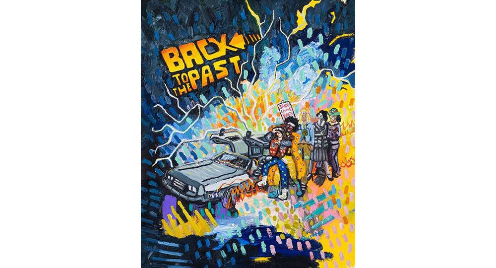 例えば「Back To The Past」の作品では、ハリウッド映画『バック・トゥ・ザ・フューチャー』を利⽤し、保守的な思想の⾼まりによって女性の権利のための戦いが⼤きく後退していることを表現。作中で、デロリアンというタイムマシンに乗るために並んでいるのは、過去100年間のアメリカの各時代のステレオタイプな服装をした女性たちだ。