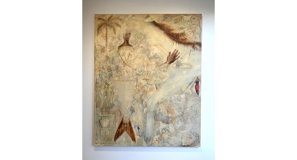 グスタフ・クリムト、ダミアン・ハーストの「自然史」シリーズ、日本画の動物表現、ミロコマチコらに影響を受けたという岩崎。その絵画で特徴的なモチーフは「生き物」だ。緑、青、茶などを基調とした柔らかな色彩のなかで生きる「生き物」は、よく知る動物のように見えるが、岩崎の絵画空間のなかでは新たなかたちを得て生きている。それは現実のすぐ隣にありながら、人間には決して立ち入ることのできない神獣達の世界を思わせる。そのとらえ所のない表情は、優しくも厳かで、人を癒し時に荒ぶる自然そのものにも感じられる。