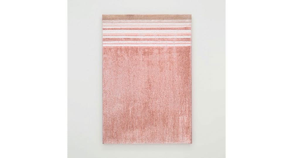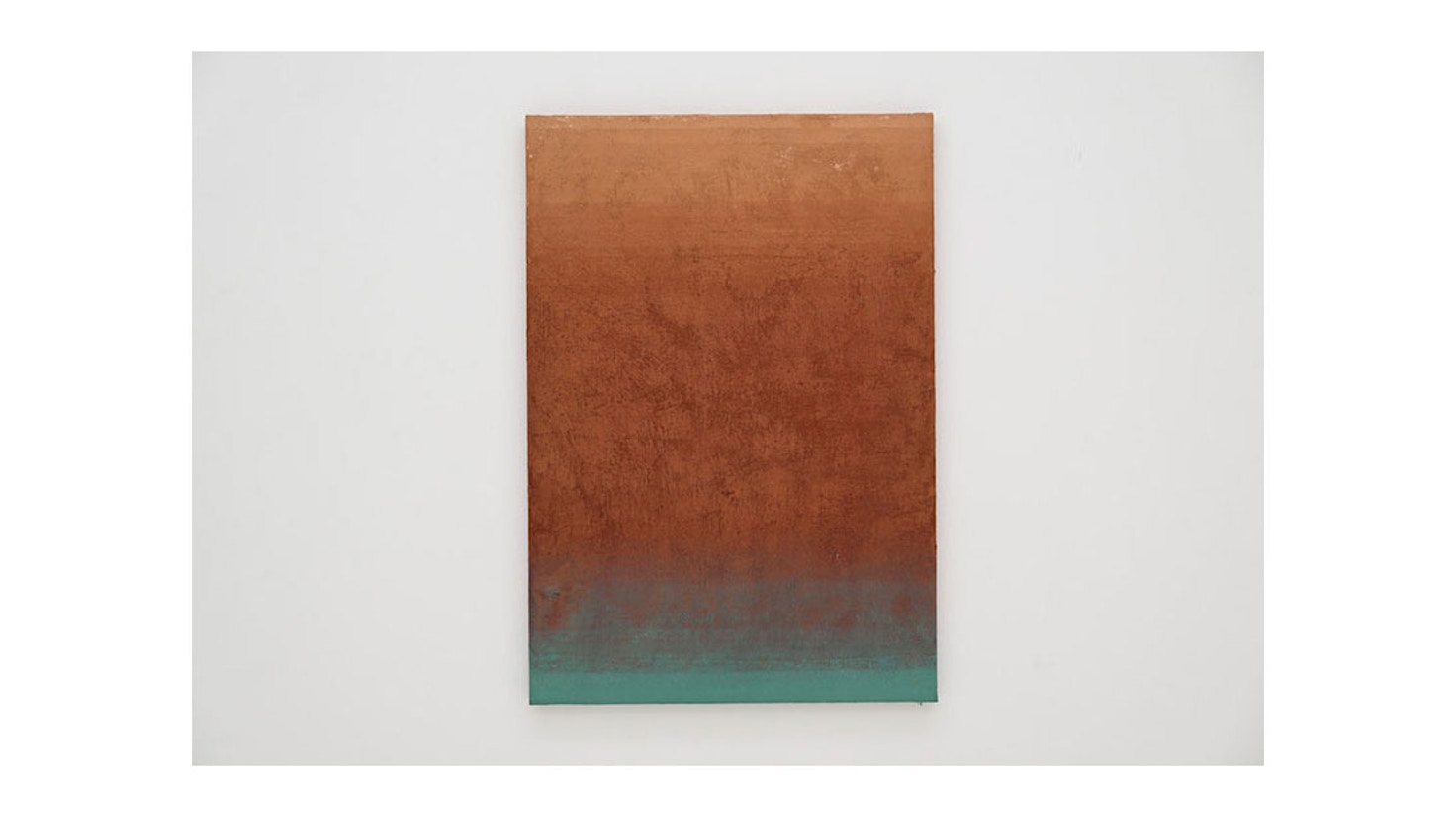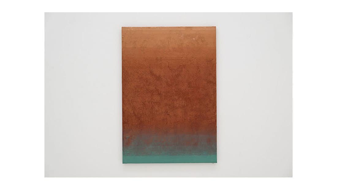 髙畠はまた高松塚古墳を訪れた際、古墳に海水が流入した際の水の跡や岩石に含まれる金属が酸化して生まれた色彩に気づきを得た。本展では金属系天然顔料の黄土、ベンガラ、緑青を用いて、繰り返しキャンバスを液体に深く沈めて色彩の層をつくり出した作品群も展示する。