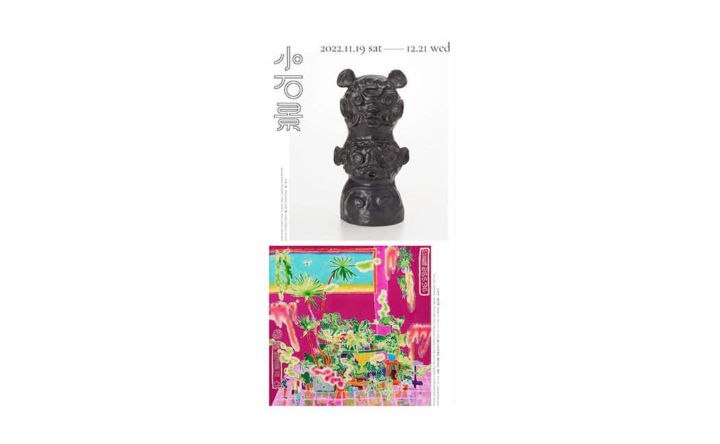 京都の⾋居は、⼩池⼀⾺と⽯井亨による2⼈展「⼩⽯景」を開催。本展では、⼩池の⿊いセラミック彫刻と⽯井の糸目友禅染絵画を、⾋居の空間に配し、本展でしか⾒ることのできない「景」を創造する。